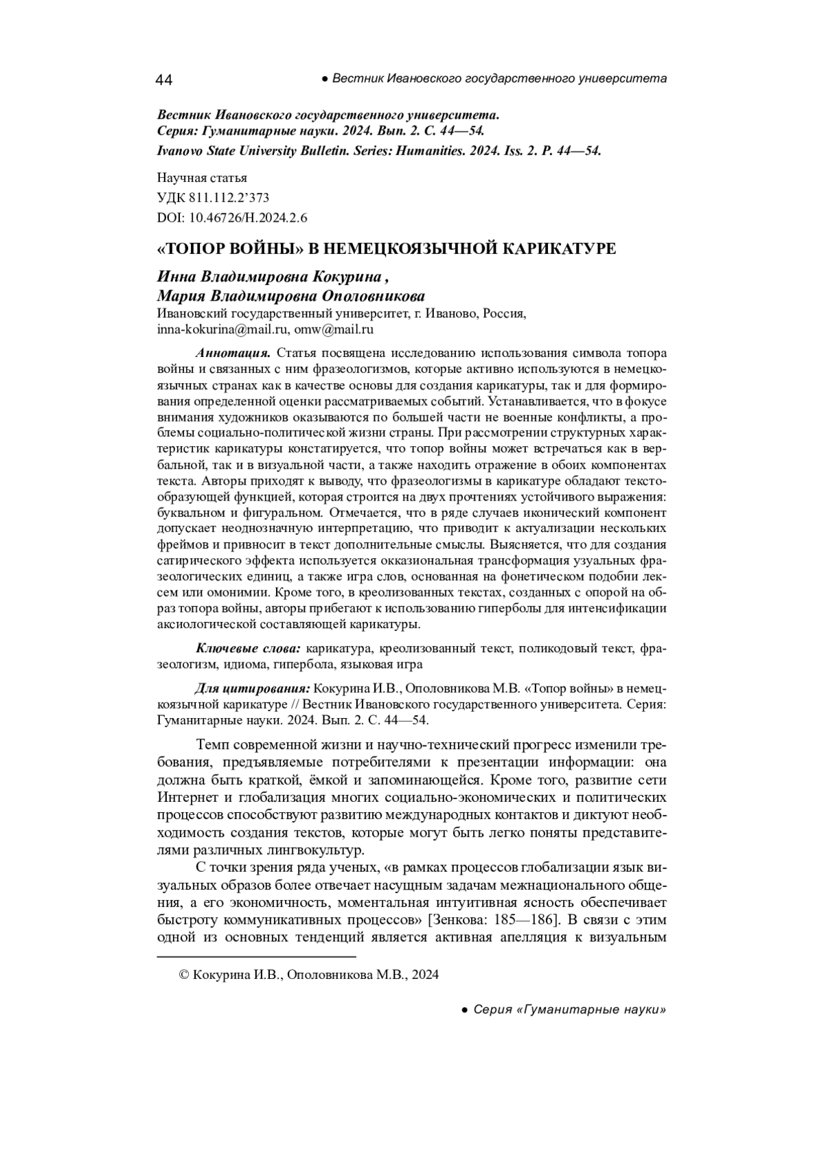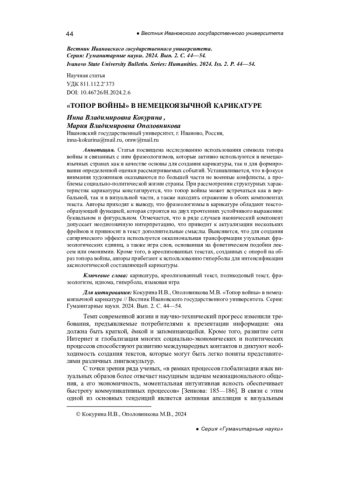 Статья посвящена исследованию использования символа топора войны и связанных с ним фразеологизмов, которые активно используются в немецкоязычных странах как в качестве основы для создания карикатуры, так и для формирования определенной оценки рассматриваемых событий. Устанавливается, что в фокусе внимания художников оказываются по большей части не военные конфликты, а проблемы социально-политической жизни страны. При рассмотрении структурных характеристик карикатуры констатируется, что топор войны может встречаться как в вербальной, так и в визуальной части, а также находить отражение в обоих компонентах текста. Авторы приходят к выводу, что фразеологизмы в карикатуре обладают текстообразующей функцией, которая строится на двух прочтениях устойчивого выражения: буквальном и фигуральном. Отмечается, что в ряде случаев иконический компонент допускает неоднозначную интерпретацию, что приводит к актуализации нескольких фреймов и привносит в текст дополнительные смыслы. Выясняется, что для создания сатирического эффекта используется окказиональная трансформация узуальных фразеологических единиц, а также игра слов, основанная на фонетическом подобии лексем или омонимии. Кроме того, в креолизованных текстах, созданных с опорой на образ топора войны, авторы прибегают к использованию гиперболы для интенсификации аксиологической составляющей карикатуры