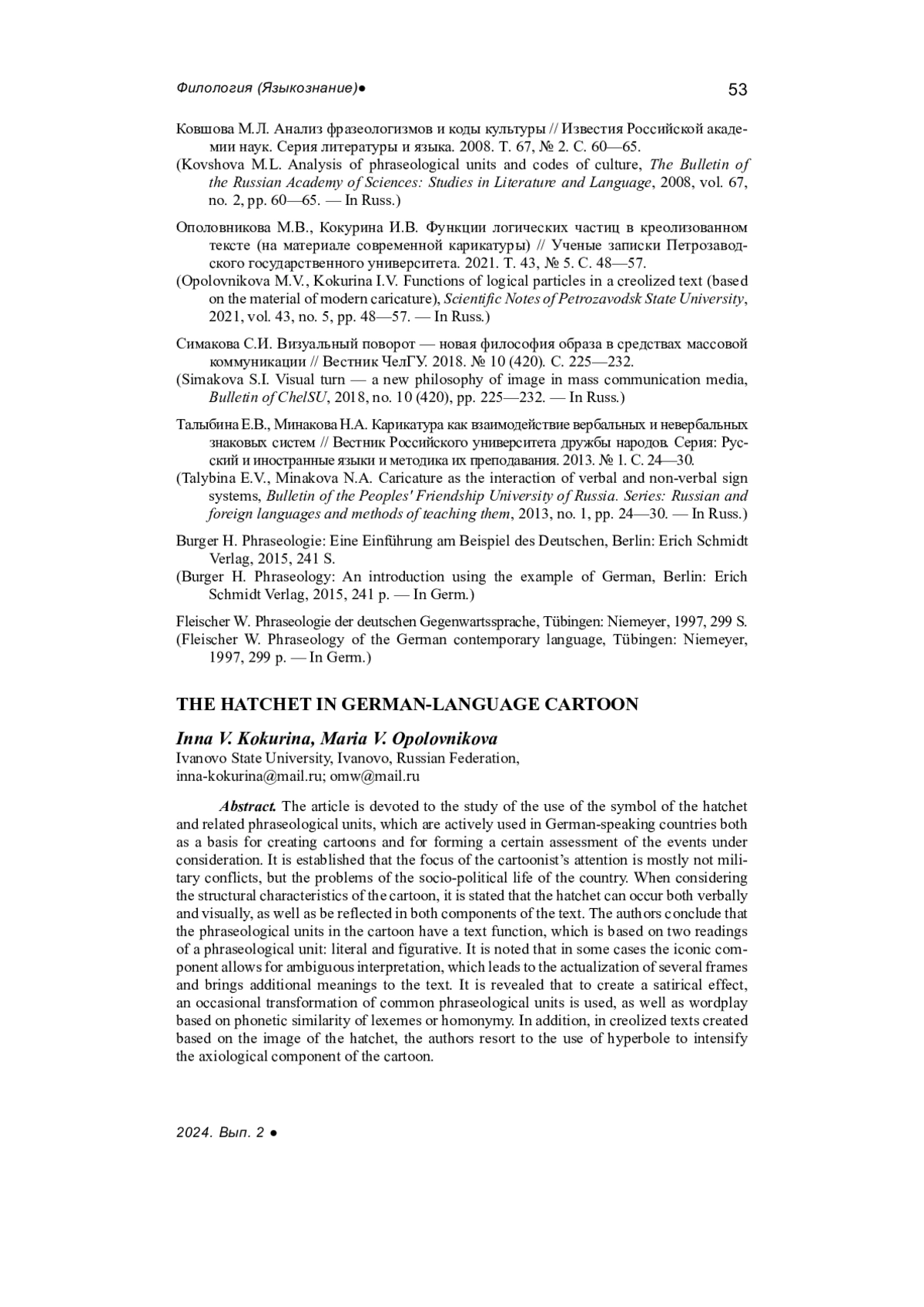 5. Ополовникова М.В., Кокурина И.В. Функции логических частиц в креолизованном тексте (на материале современной карикатуры) // Ученые записки Петрозаводского государственного университета. 2021. Т. 43, № 5. С. 48-57. EDN: MYVDEE