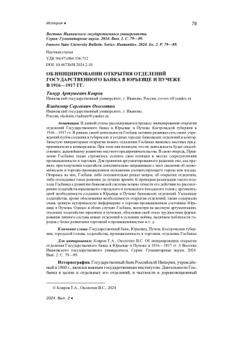 Kovrov T.A., Okolotin V.S. From the history of the economic justification and opening of the branch of the State Bank in Kineshma at the beginning of the 20th century, Bulletin of Kostroma State University, 2023, vol. 29, no. 3, pp. 21-28. - In Russ. EDN: NPGAPT