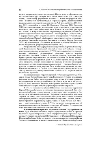 Историография. Государственный банк Российской Империи, учреждённый в 1860 г., являлся важным государственным институтом. Деятельности Госбанка в целом и отдельных его отделений, в частности в дореволюционный период, посвящены несколько исследований. Прежде всего, это фундаментальный коллективный труд «История Банка России. 1860—2010» (том 1) [История Банка]. Центральному учреждению Госбанка — Санкт-Петербургской конторе — посвятил свой научный труд В. В. Морозан [Морозан]. Также об истории провинциальных учреждений написаны работы А. В. Бугрова [Бугров 2004; Бугров 2012], монография и статьи В. С. Околотина [Околотин 2006; Околотин 2018], исторические очерки, воспоминания и другие материалы о деятельности банковских учреждений на Рязанской земле [Банковское дело 2004], ряд научных статей Т. А. Коврова и Околотина: о правовом регулировании деятельности учётно-ссудных комитетов при отделениях Госбанка [Ковров, Околотин 2021], о наградах членов учётно-ссудных комитетов при отделениях Госбанка Владимирской губернии [Там же], о фабрикантах в деятельности учётно-ссудного комитета при Иваново-Вознесенском банковском отделении [Ковров, Околотин 2022], об экономическом обосновании и открытии отделения Госбанка в Кинешме Костромской губернии [Ковров, Околотин 2023].