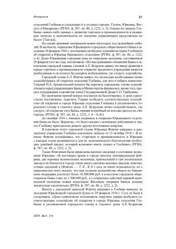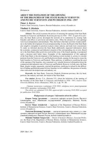 В данной статье рассматривается процесс инициирования открытия отделений Государственного банка в Юрьевце и Пучеже Костромской губернии в 1916—1917 гг. В рамках своей деятельности Госбанк активно развивал сеть своих учреждений путём создания в губернских и уездных городах банковских отделений и контор. Зачастую инициаторами открытия нового отделения Госбанка являлись местные предприниматели и коммерсанты. При этом они полагали, что их деятельность будет способствовать дальнейшему развитию местного предпринимательства. В свою очередь, Правление Госбанка также стремилось усилить свои позиции в местах сосредоточения промышленности и торговли. Для принятия аргументированного решения оно, как правило, при получении ходатайств дополнительно запрашивало с мест сведения об экономическом и торгово-промышленном положении соответствующего города или посада. Опираясь на них, Госбанк либо положительно решал вопрос об открытии отделения, либо откладывал такое решение до лучших времён. К примерам реализации такого подхода Госбанка к развитию банковской системы можно отнести его действия по рассмотрению ходатайств юрьевецкого городского и пучежского посадского голов с аргументацией необходимости создания в Юрьевце и Пучеже банковских отделений. Указанные ходатайства, кроме обоснования необходимости открытия отделений, также содержали очень ценную историческую информацию о торгово-промышленном состоянии Юрьевца и Пучежа. Однако в обоих случаях Госбанк, несмотря на весомую аргументацию, отклонил ходатайство юрьевчан и пучежан, обосновав свой отказ трудностями формирования личного состава новых отделений в условиях войны, наличием поблизости городов с более развитыми торговлей и промышленностью и т. д.