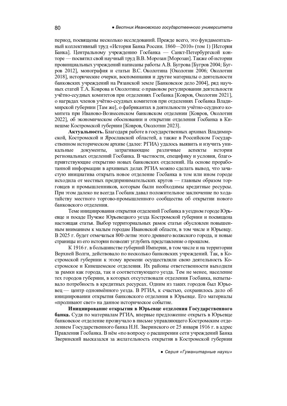 6. Ковров Т.А., Околотин В.С. Из истории экономического обоснования и открытия отделения Государственного банка в г. Кинешме в начале XX века // Вестник Костромского государственного университета. 2023. Т. 29, № 3. С. 21-28. EDN: NPGAPT