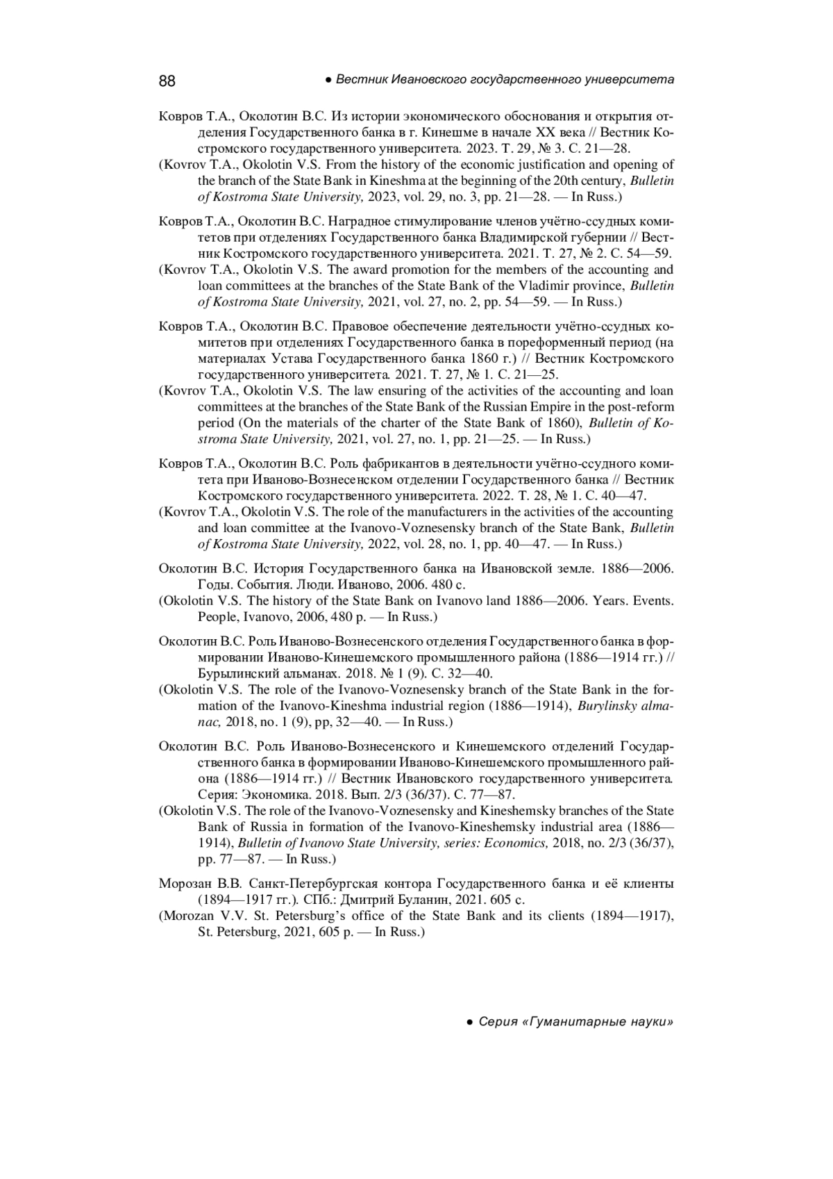 11. Околотин В.С. Роль Иваново-Вознесенского отделения Государственного банка в формировании Иваново-Кинешемского промышленного района (1886-1914 гг.) // Бурылинский альманах. 2018. № 1 (9). С. 32-40.