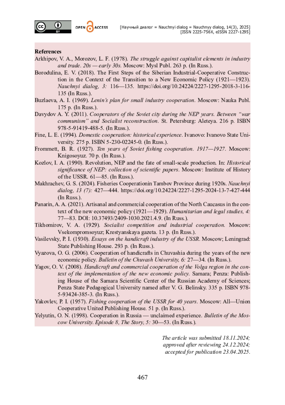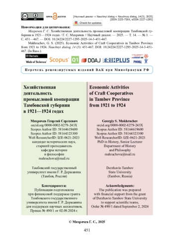 9. Махрачев Г. С. Промысловая кооперация на территории Тамбовской губернии в 1920-х годах / Г. С. Махрачев // Научный диалог. - 2024. - Т. 13. - № 7. - С. 427-444. - https://doi.org/10.24224/2227-1295-2024-13-7-427-444.