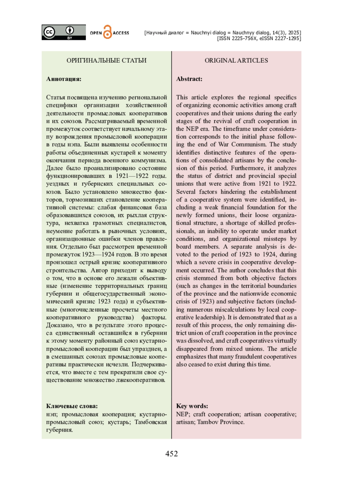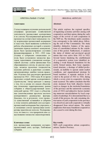 Статья посвящена изучению региональной специфики организации хозяйственной деятельности промысловых кооперативов и их союзов. Рассматриваемый временной промежуток соответствует начальному этапу возрождения промысловой кооперации в годы нэпа. Были выявлены особенности работы объединенных кустарей к моменту окончания периода военного коммунизма. Далее было проанализировано состояние функционировавших в 1921—1922 годы. уездных и губернских специальных союзов. Было установлено множество факторов, тормозивших становление кооперативной системы: слабая финансовая база образовавшихся союзов, их рыхлая структура, нехватка грамотных специалистов, неумение работать в рыночных условиях, организационные ошибки членов правления. Отдельно был рассмотрен временной промежуток 1923—1924 годов. В это время произошел острый кризис кооперативного строительства. Автор приходит к выводу о том, что в основе его лежали объективные (изменение территориальных границ губернии и общегосударственный экономический кризис 1923 года) и субъективные (многочисленные просчеты местного кооперативного руководства) факторы. Доказано, что в результате этого процесса единственный оставшийся в губернии к этому моменту районный союз кустарно-промысловой кооперации был упразднен, а в смешанных союзах промысловые кооперативы практически исчезли. Подчеркивается, что вместе с тем прекратили свое существование множество лжекооперативов.