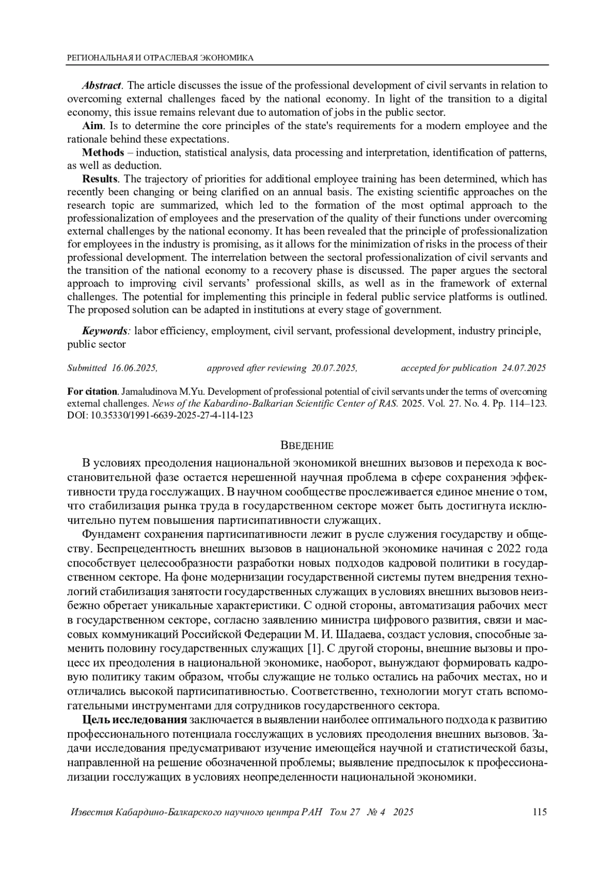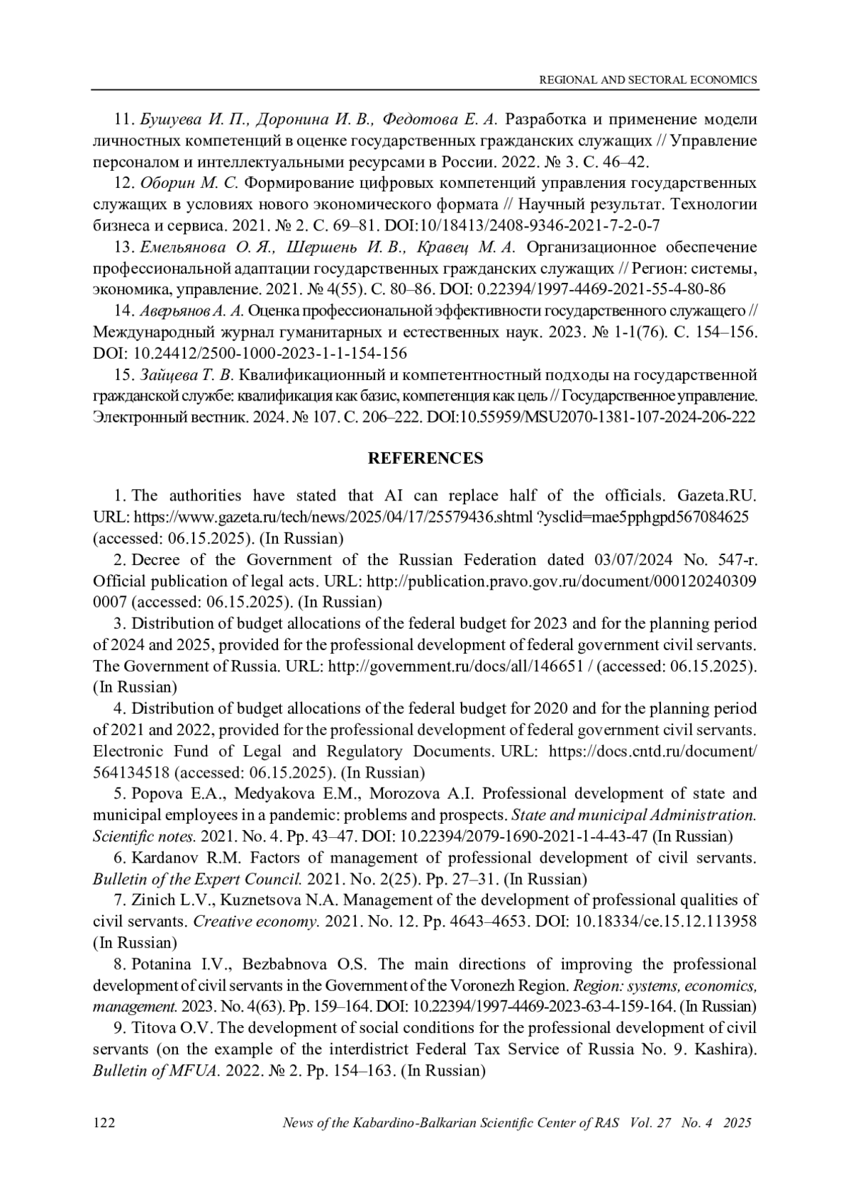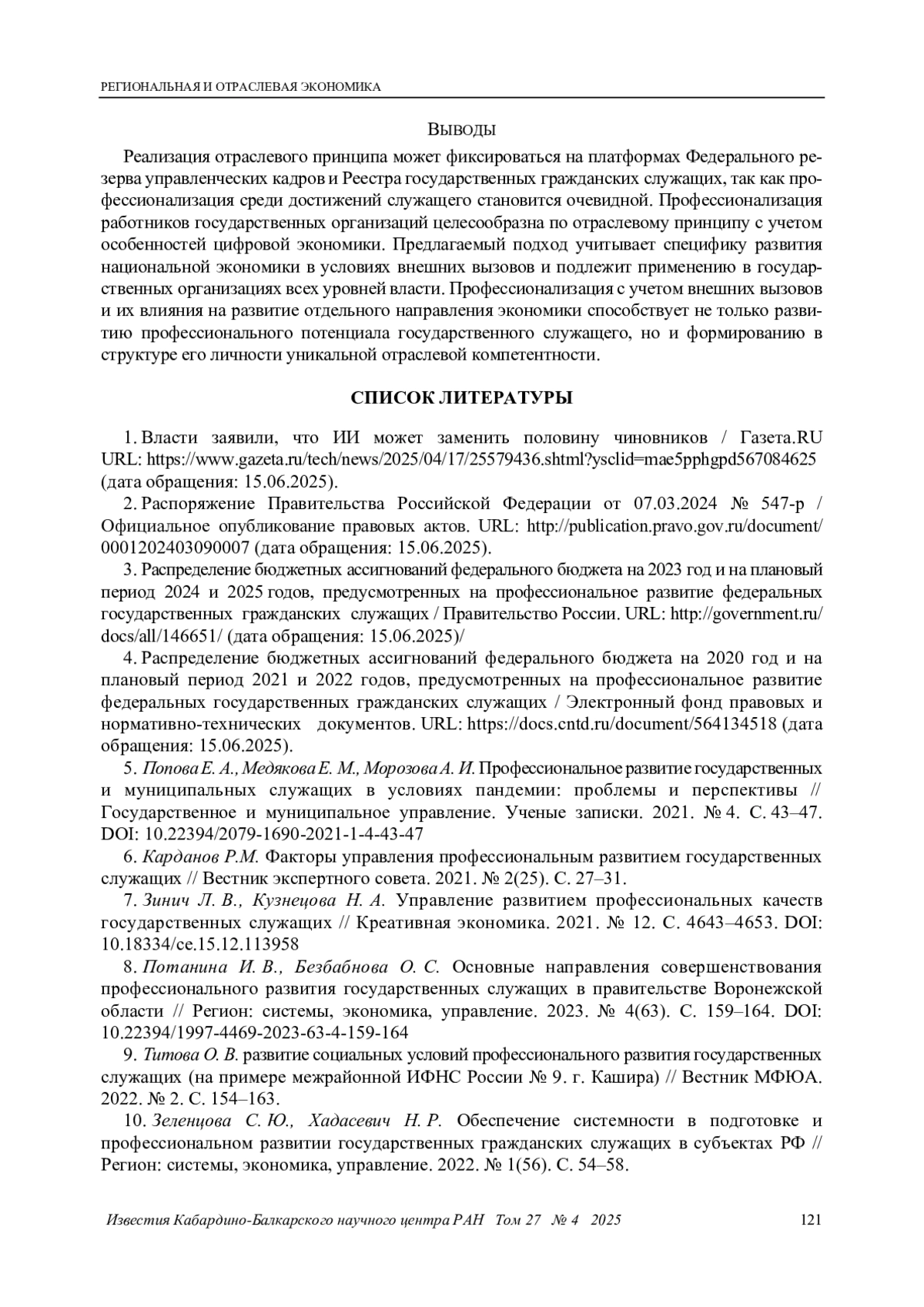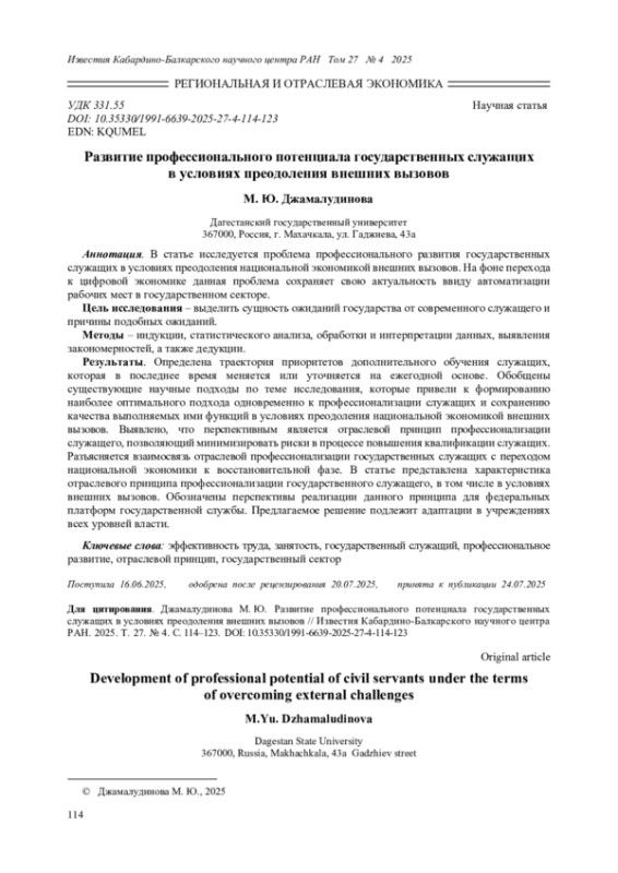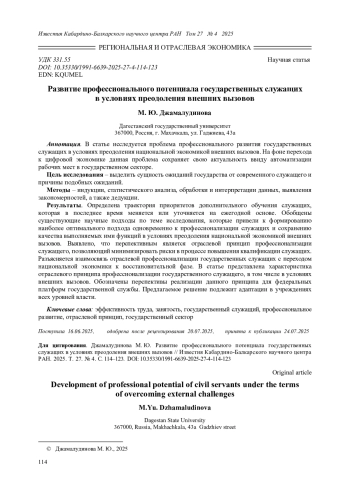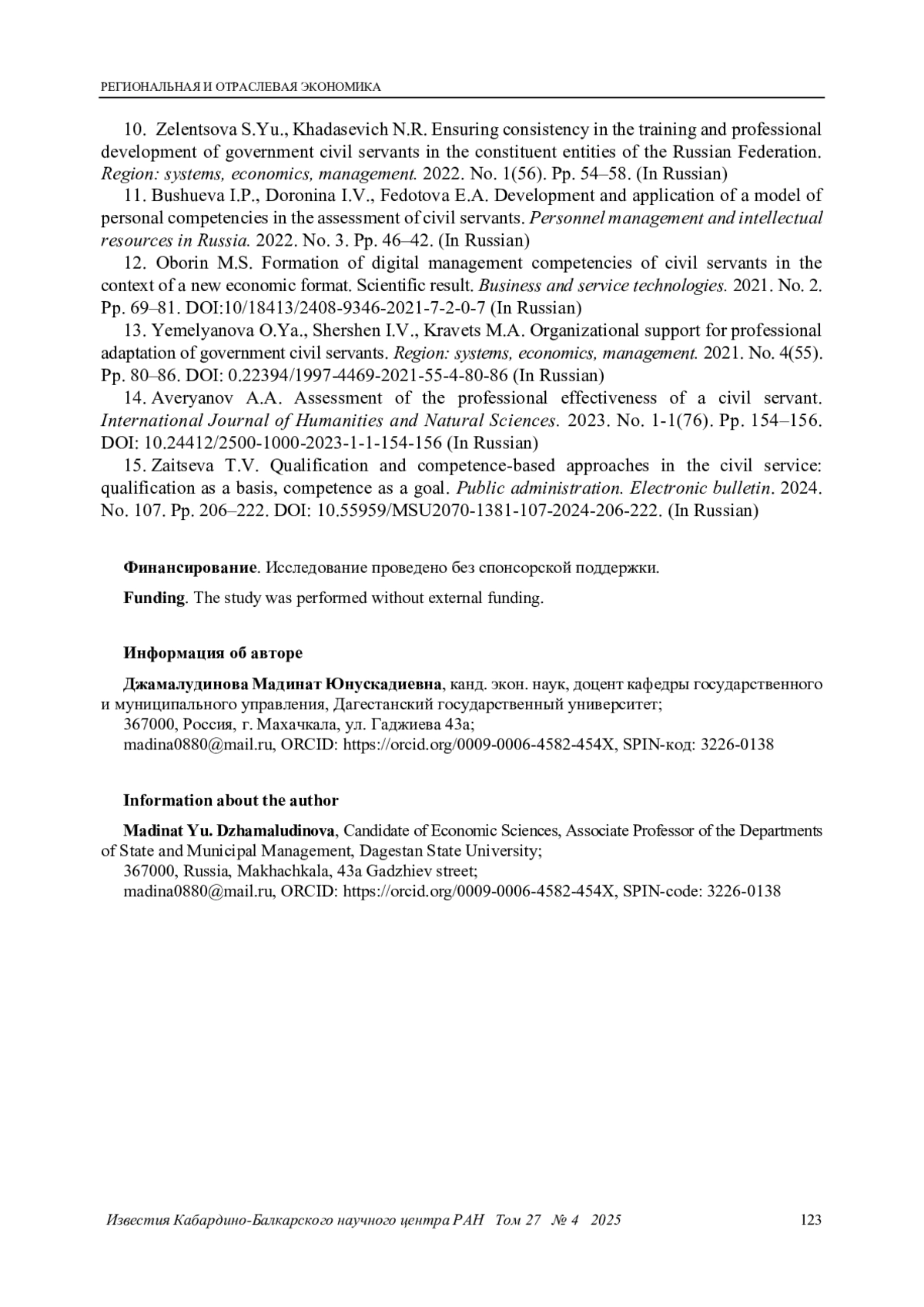 ДЖАМАЛУДИНОВА М. Ю. РАЗВИТИЕ ПРОФЕССИОНАЛЬНОГО ПОТЕНЦИАЛА ГОСУДАРСТВЕННЫХ СЛУЖАЩИХ В УСЛОВИЯХ ПРЕОДОЛЕНИЯ ВНЕШНИХ ВЫЗОВОВ // ИЗВЕСТИЯ КАБАРДИНО-БАЛКАРСКОГО НАУЧНОГО ЦЕНТРА РАН. 2025. ТОМ 27 № 4