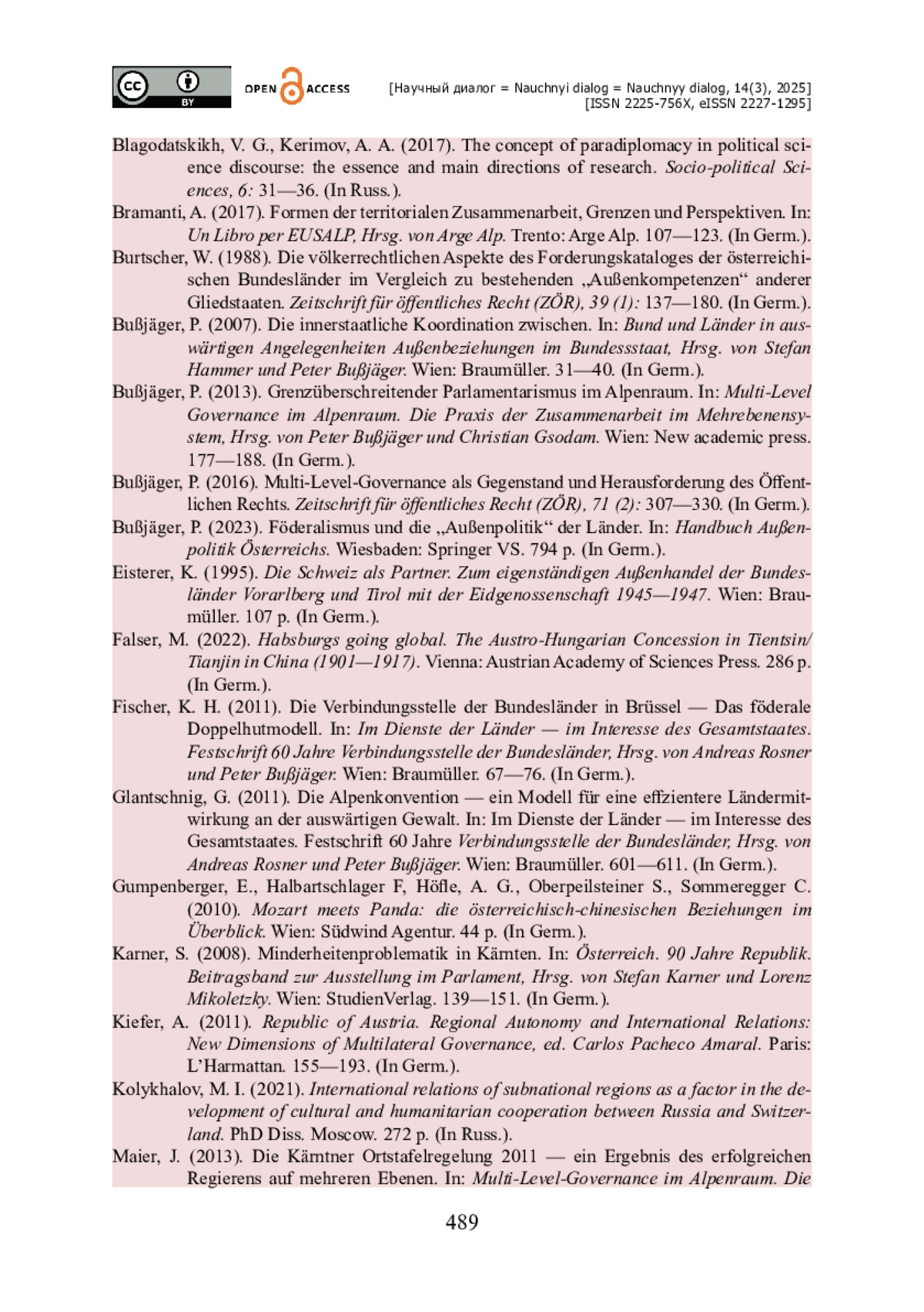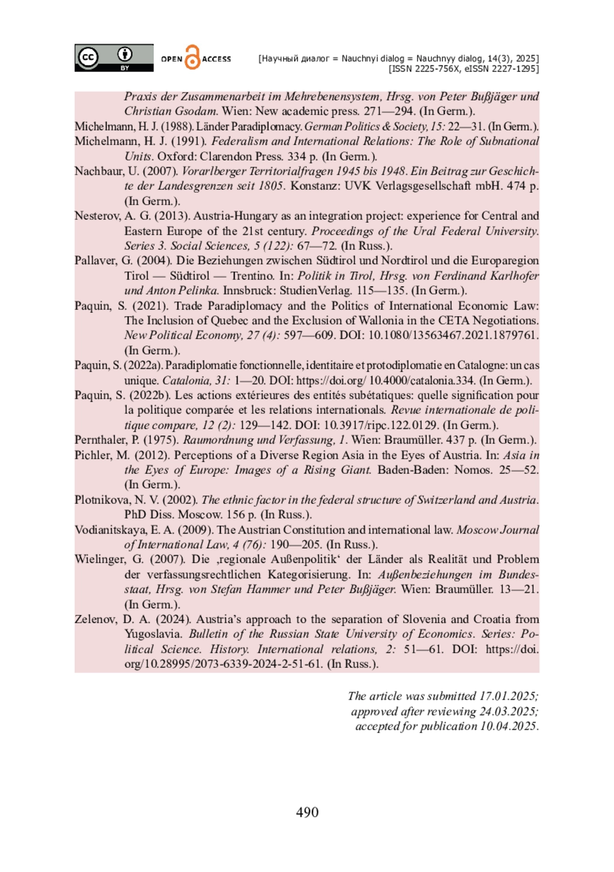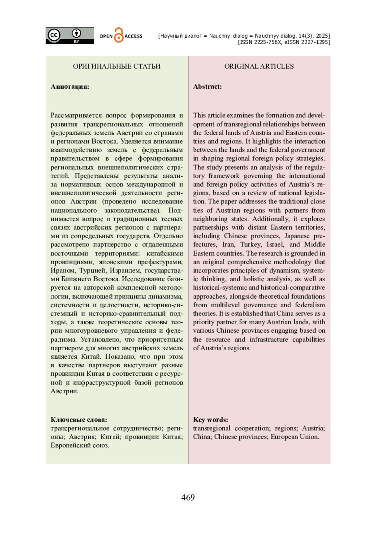 МУСЛИМОВА Е. О., НЕСТЕРОВ А. Г., КАТУНЦЕВ В. А. ФЕДЕРАЛЬНЫЕ ЗЕМЛИ АВСТРИИ В ТРАНСРЕГИОНАЛЬНОМ СОТРУДНИЧЕСТВЕ С РЕГИОНАМИ И СТРАНАМИ ВОСТОКА В XX—XXI ВЕКАХ // НАУЧНЫЙ ДИАЛОГ. 2025. ТОМ 14, № 3