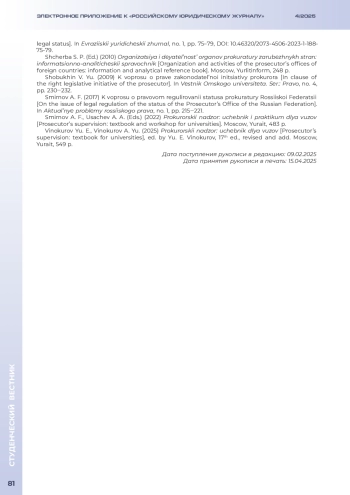 15. Шарифулин А. А. Прокуратура Российской Федерации: о некоторых особенностях правового положения // Евразийский юридический журнал. 2024. № 1. С. 75-79. DOI: 10.46320/2073-45062023-1-188-75-79 EDN: SILQTT