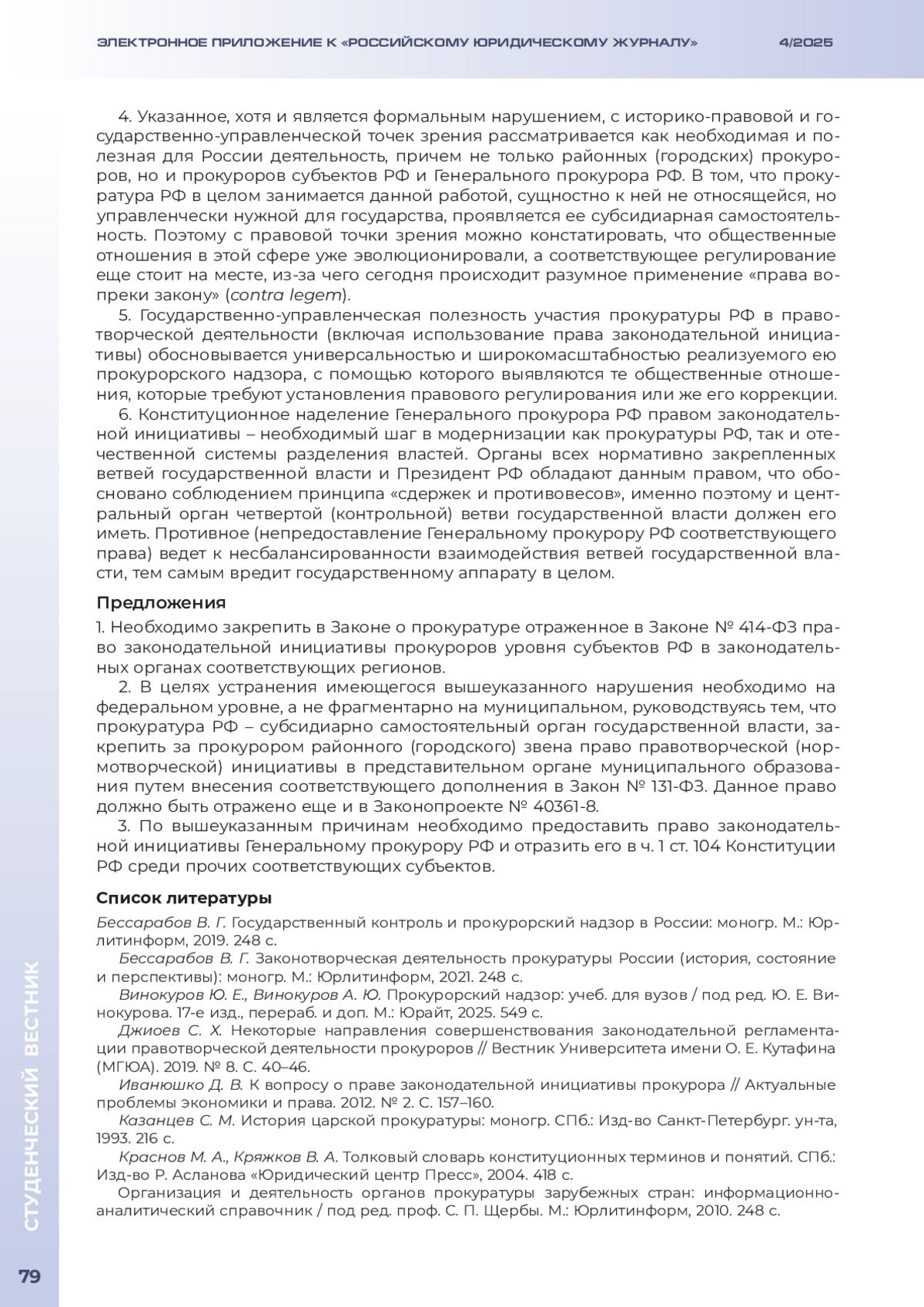 2. Бессарабов В. Г. Законотворческая деятельность прокуратуры России (история, состояние и перспективы): моногр. М.: Юрлитинформ, 2021. 248 с. EDN: BVPBJX