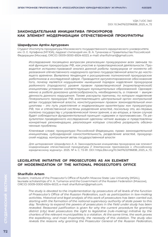 Исследование посвящено вопросам реализации прокурорами всех звеньев такой функции прокуратуры РФ, как участие в правотворческой деятельности. Проводится историко-правовой анализ данной работы прокуроров от момента образования отечественного надзорного органа государственной власти до настоящего времени. Выявлена тенденция к расширению полномочий прокурорских работников в исследуемой сфере. Приводится аргументированное обоснование того, почему является нарушением нынешний порядок наделения прокуроров районного (городского) уровня правом правотворческой (нормотворческой) инициативы уставами соответствующих муниципальных образований. Одновременно в работе доказана целесообразность, необходимость, а главное - вынужденность данного нарушения. Также раскрыты причины, по которым наделение Генерального прокурора РФ, возглавляющего центральный орган контрольной ветви государственной власти, конституционным правом законодательной инициативы - это путь укрепления и модернизации архитектуры как прокуратуры РФ, так и отечественной системы разделения властей, поскольку это, во-первых, полезно государству с управленческой точки зрения, а во-вторых, в таком случае будет соблюдаться фундаментальный принцип «сдержек и противовесов». По результатам проведенного исследования сделаны четкие выводы и представлены конкретные рекомендации, реализация которых способна разрешить обозначенные проблемы.