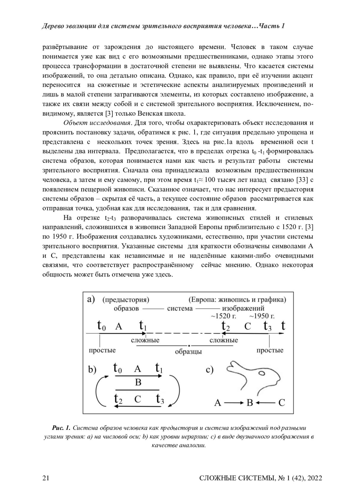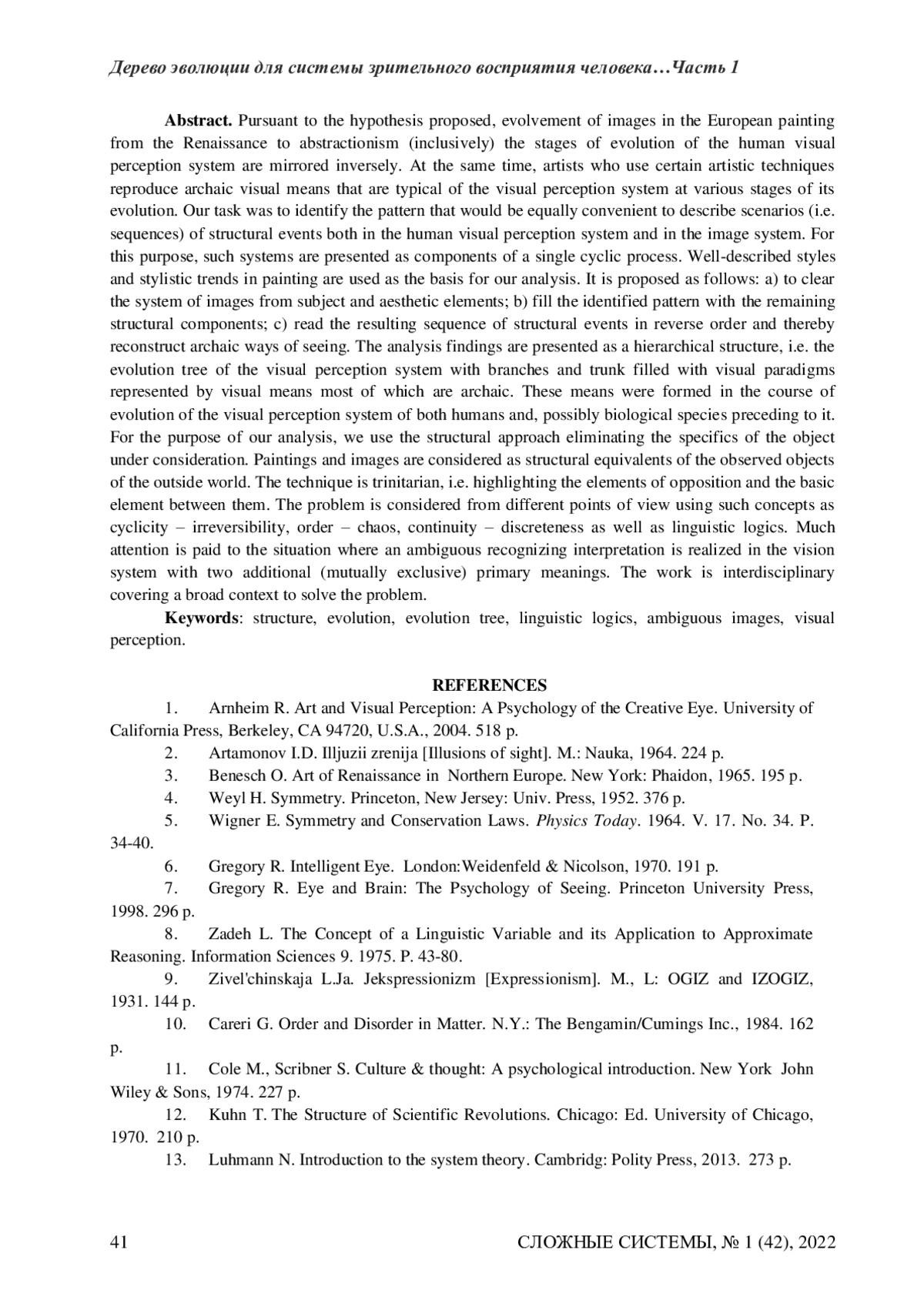Выдвигается гипотеза, согласно которой при развёртывании изображений в европейской живописи от эпохи Возрождения до абстракционизма включительно повторяются в обратном порядке этапы эволюции системы зрительного восприятия человека как вида. При этом художниками, которые используют те или иные художественные приёмы, воспроизводятся архаические способы видения, характерные для системы зрительного восприятия на разных этапах её формирования. Ставится задача выявить схему, с помощью которой одинаково удобно описывать сценарии - последовательности структурных событий, как в системе зрительного восприятия человека, так и в системе изображений. Для этого названные системы представляются как компоненты единого циклического процесса. Хорошо описанные стили и стилевые направления в живописи рассматриваются в качестве основы анализа. Предлагается: а) очистить систему изображений от сюжетных и эстетических элементов; b) заполнить выявленную схему оставшимися структурными компонентами; с) прочитать полученную последовательность структурных событий в обратном порядке и тем самым реконструировать архаические способы видения. Результат анализа представляется как иерархическая конструкция - дерево эволюции системы зрительного восприятия, ветви и ствол которого заполнены визуальными парадигмами - способами видения, большая часть которых является архаикой. Названные способы сформировались в процессе эволюции условного носителя системы зрительного восприятия, к которому относится не только человек, но и, возможно, предшествовавшие ему биологические виды. Используется структурный подход, ориентированный на отказ от специфики исследуемого объекта. Изображения и образы рассматриваются как структурные эквиваленты наблюдаемых объектов внешнего мира. Методика является тринитарной, т. е. выделяются элементы оппозиции и базовый элемент между ними. Проблема рассматривается с разных точек зрения. Используются такие представления, как цикличность - необратимость, порядок - хаос, непрерывность - дискретность и лингвистическая логика. Большое внимание уделяется ситуации, при которой в системе зрения реализуется двусмысленная “распознающая” интерпретация - появляются и конкурируют два дополнительных (взаимоисключающих) первичных смысла. Работа является междисциплинарной, для решения задачи привлекается широкий контекст.