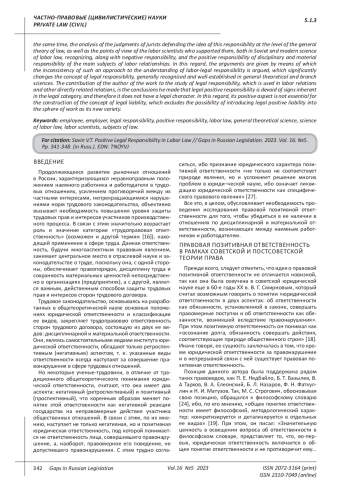 Ключевые фразы: НАЕМНЫЙ РАБОТНИК, РАБОТОДАТЕЛЬ, ЮРИДИЧЕСКАЯ ОТВЕТСТВЕННОСТЬ, позитивная ответственность, ТРУДОВОЕ ПРАВО, общетеоретическая наука, наука трудового права, ученые-трудовики, субъекты права