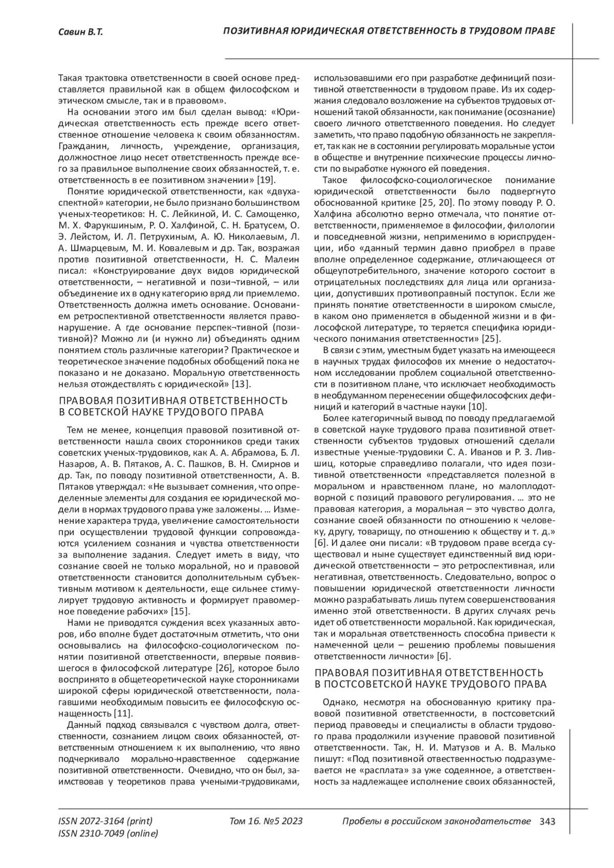 САВИН В. Т. ПОЗИТИВНАЯ ЮРИДИЧЕСКАЯ ОТВЕТСТВЕННОСТЬ В ТРУДОВОМ ПРАВЕ // ПРОБЕЛЫ В РОССИЙСКОМ ЗАКОНОДАТЕЛЬСТВЕ. 2023. Т. 16 № 5