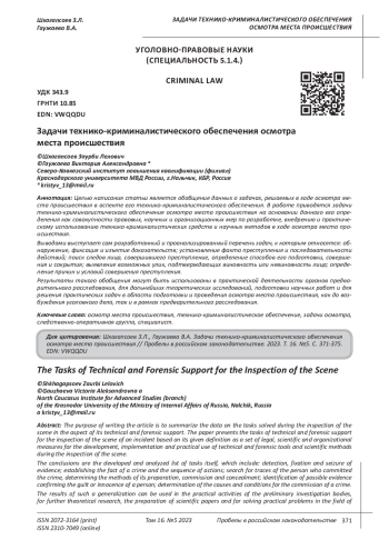 Целью написания статьи является обобщение данных о задачах, решаемых в ходе осмотра места происшествия в аспекте его технико-криминалистического обеспечения. В работе приводятся задачи технико-криминалистического обеспечения осмотра места происшествия на основании данного его определения как совокупности правовых, научных и организационных мер по разработке, внедрению и практическому использованию технико-криминалистических средств и научных методов в ходе осмотра места происшествия. Выводами выступает сам разработанный и проанализированный перечень задач, к которым относятся: обнаружение, фиксация и изъятие доказательств; установление факта преступления и последовательности действий; поиск следов лица, совершившего преступление, определение способов его подготовки, совершения и сокрытия; выявление возможных улик, подтверждающих виновность или невиновность лица; определение причин и условий совершения преступления. Результаты такого обобщения могут быть использованы в практической деятельности органов предварительного расследования, для дальнейших теоретических исследований, подготовки научных работ и для решения практических задач в области подготовки и проведения осмотра места происшествия, как до возбуждения уголовного дела, так и в рамках предварительного расследования.