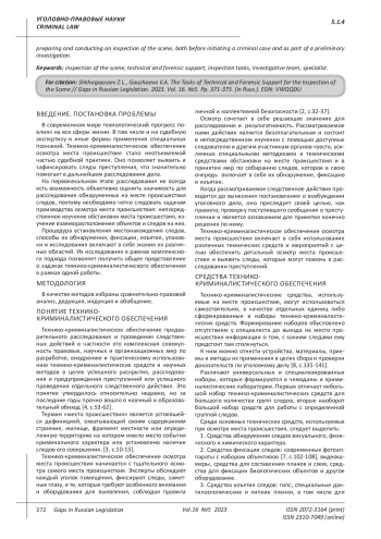 В современном мире технологический прогресс повлиял на все сферы жизни. В том числе и на судебную экспертизу и иные формы применения специальных познаний. Технико-криминалистическое обеспечение осмотра места происшествия стало неотъемлемой частью судебной практики. Оно позволяет выявить и зафиксировать следы преступления, что значительно помогает в дальнейшем расследовании дела. На первоначальном этапе расследования не всегда есть возможность объективно оценить значимость для расследования обнаруженных на месте происшествия следов, поэтому необходимо четко следовать задачам производства осмотра места происшествия: непосредственное изучение обстановки места происшествия, изучение взаиморасположения объектов и следов на них. Процедура установления местонахождения следов, способы их обнаружения, фиксации, изъятия, упаковки и исследования включают в себя знания из различных областей. Их исследование в рамках комплексного подхода позволяет получить общее представление о задачах технико-криминалистического обеспечения в рамках одной работы.