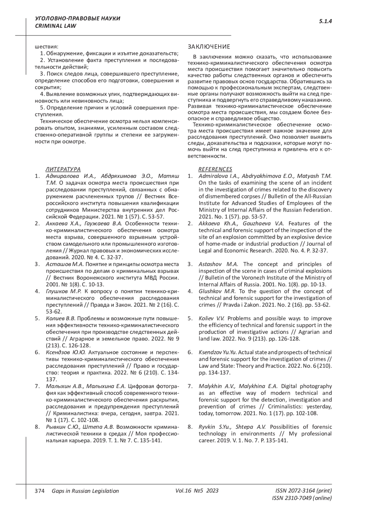 5. Колиев В.В. Проблемы и возможные пути повышения эффективности технико-криминалистического обеспечения при производстве следственных действий // Аграрное и земельное право. 2022. № 9 (213). С. 126-128. EDN: UNQPHT