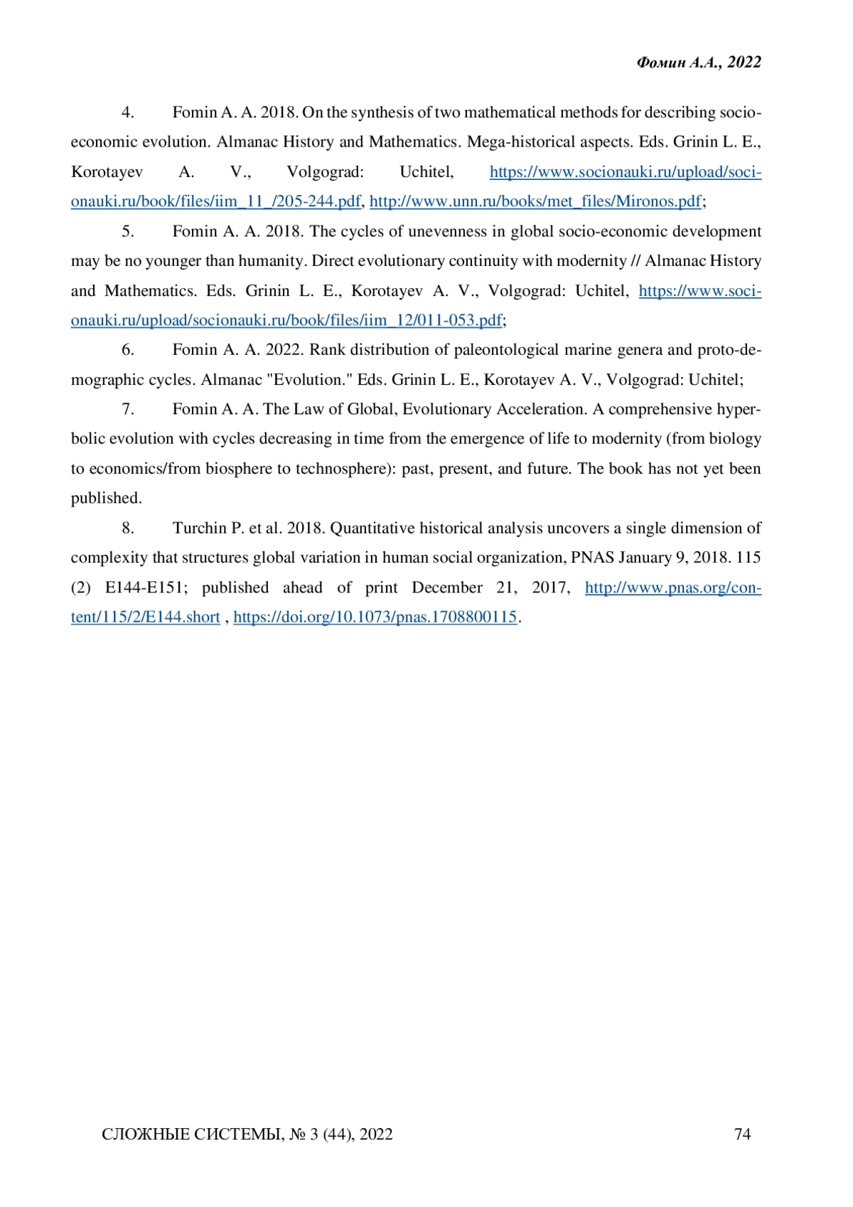 5. Фомин А. А. 2018. Циклы неравномерности мирового социально-экономического развития могут быть не моложе человека. Прямая эволюционная преемственность с современностью //Альманах История и математика. Отв. ред. Гринин Л. Е., Коротаев А. В., Волгоград: Учитель, https://www.socionauki.ru/upload/socionauki.ru/book/files/iim_12/011-053.pdf. EDN: LXMIRN