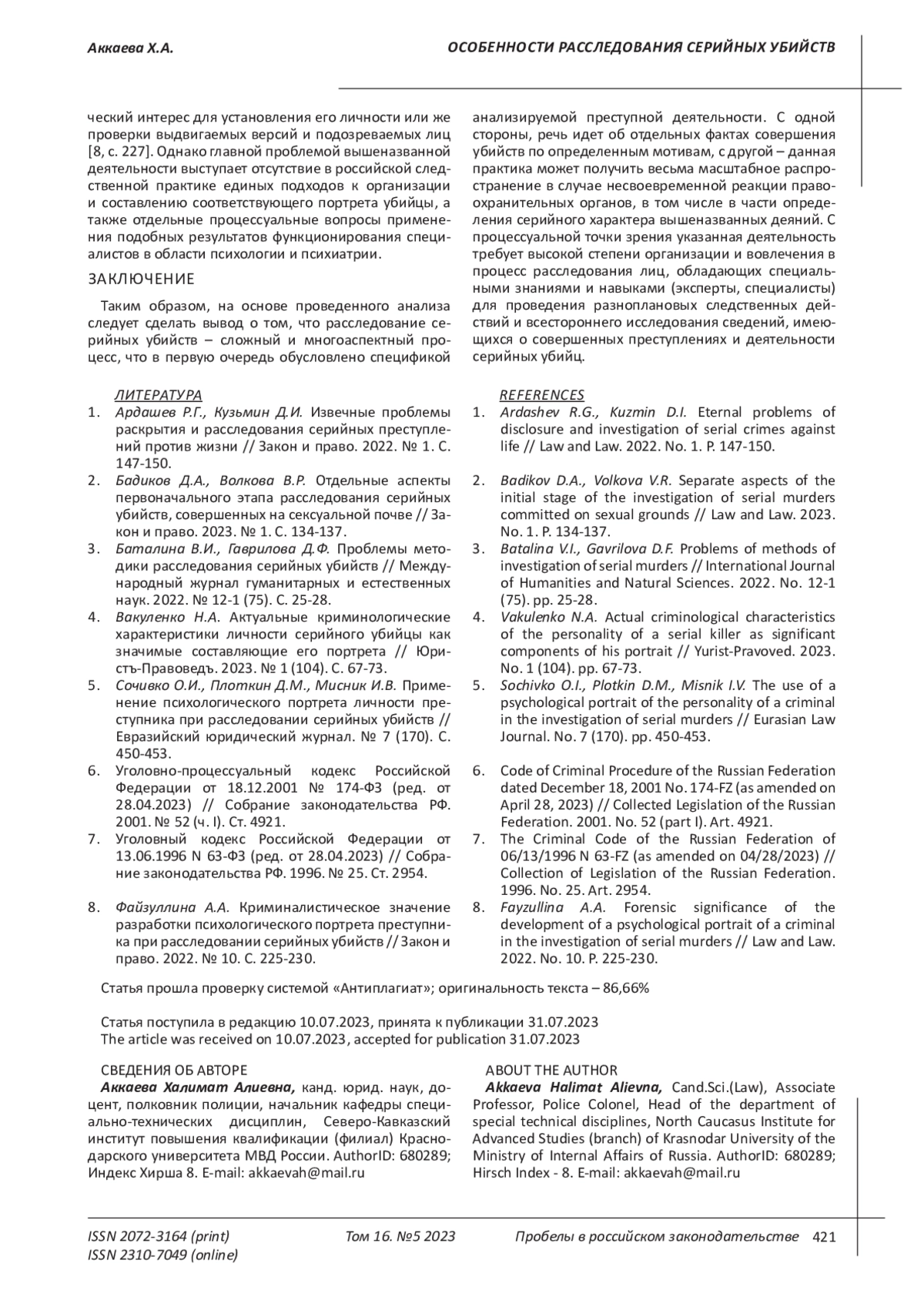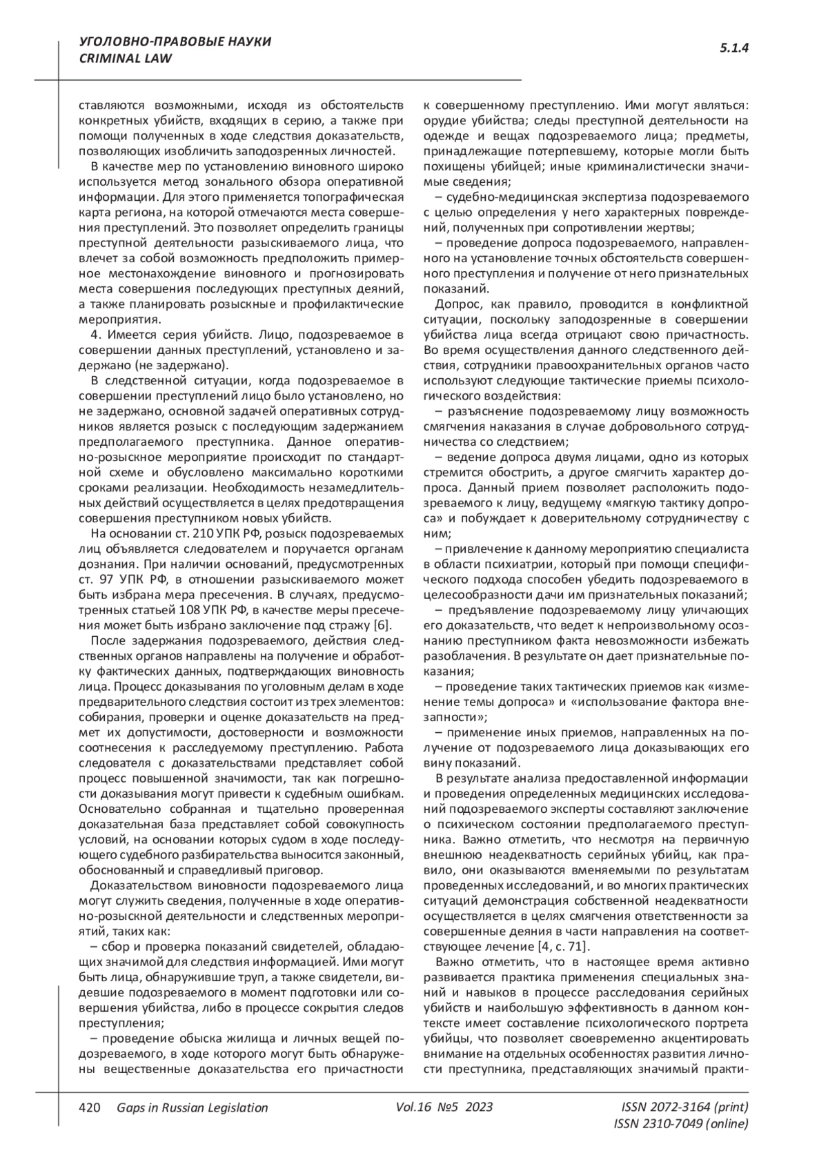 2. Бадиков Д.А., Волкова В.Р. Отдельные аспекты первоначального этапа расследования серийных убийств, совершенных на сексуальной почве // Закон и право. 2023. № 1. С. 134-137. EDN: CIYHCQ
