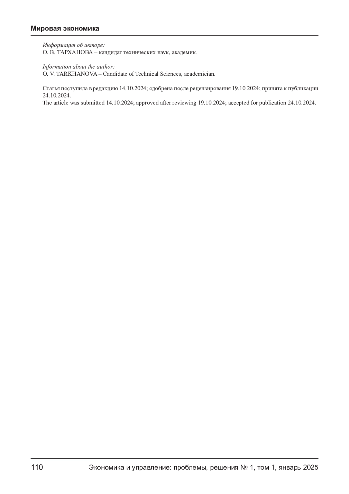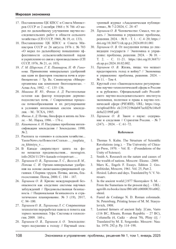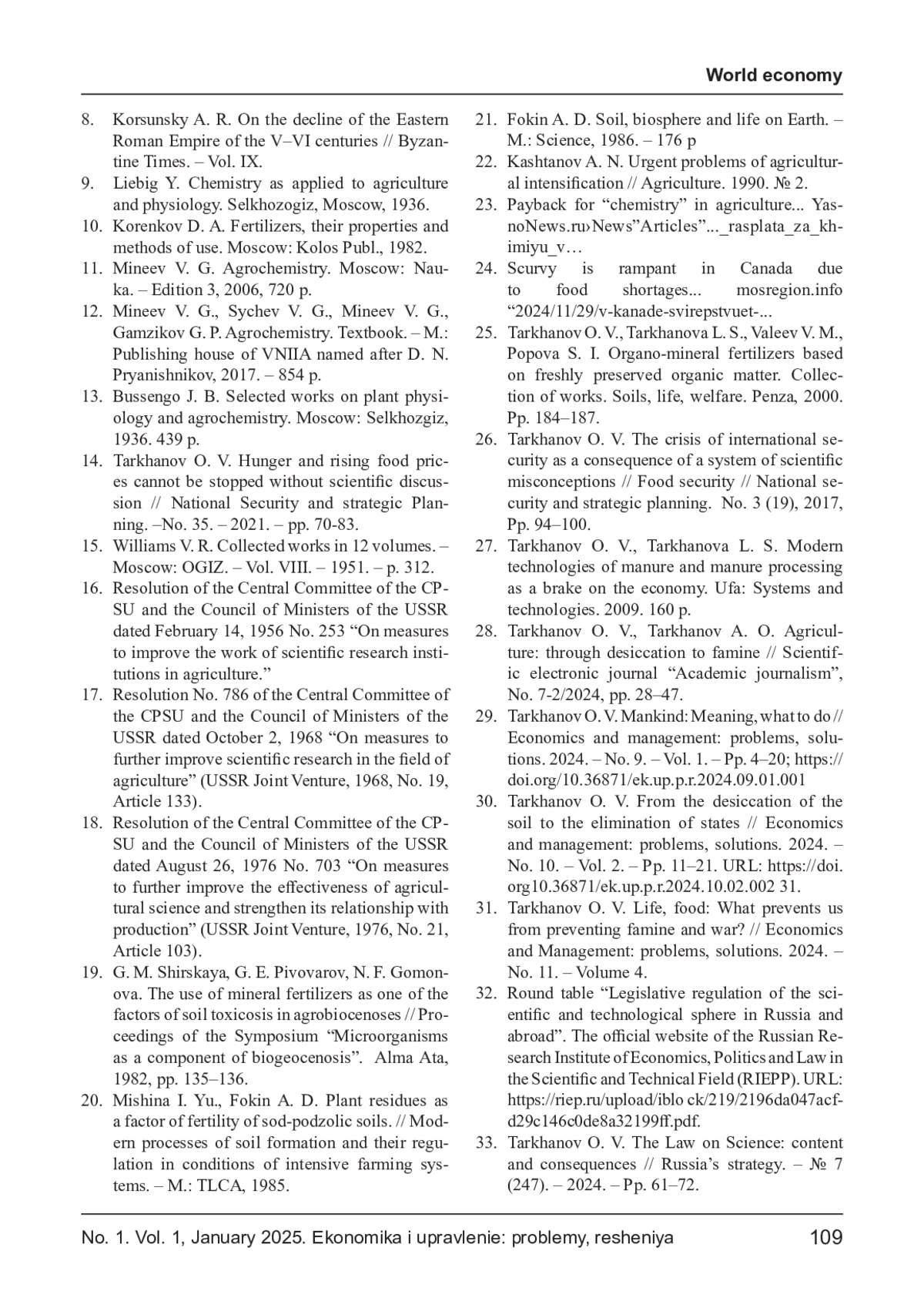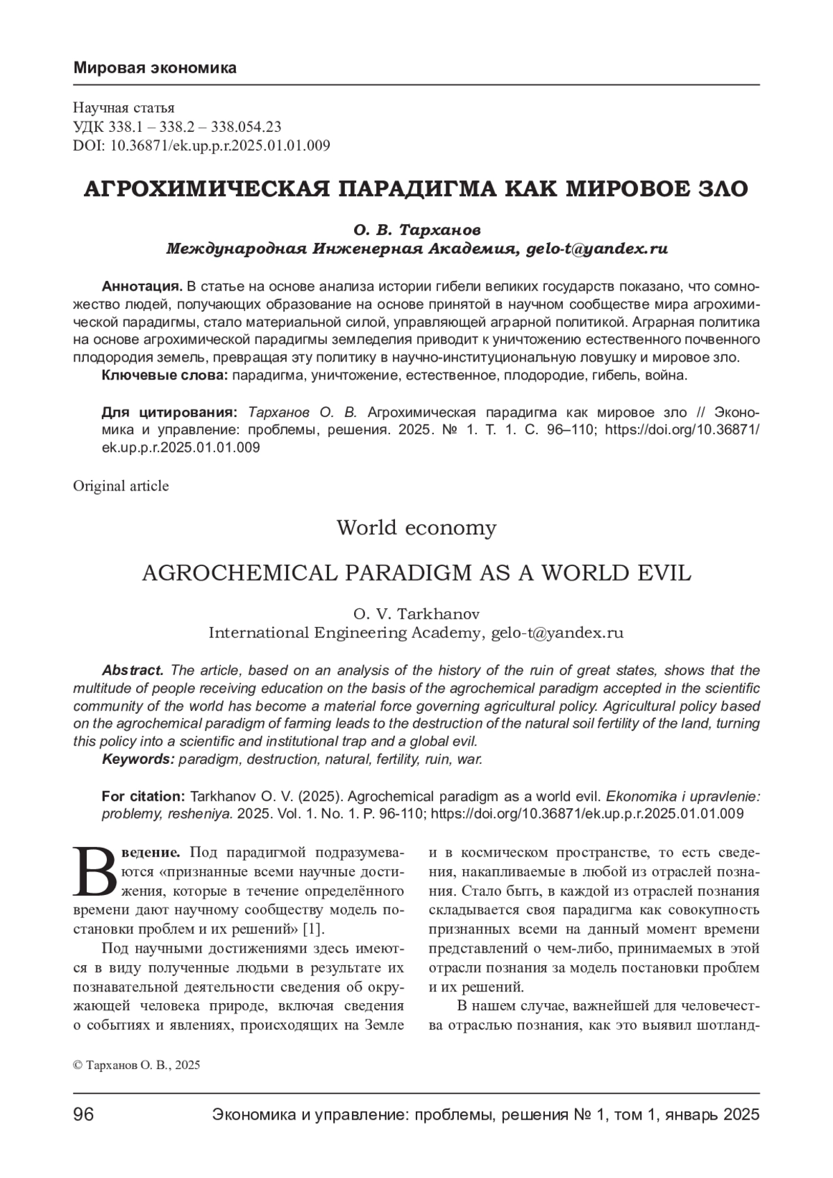 30. Тарханов О. В. От иссушения почвы до ликвидации государств // Экономика и управление: проблемы, решения. 2024. - № 10. - Т. 2. - С. 11-21. https://doi.org. DOI: 10.36871/ek.up.p.r.2024.10.02.002 EDN: SDSHFW 31. Тарханов О. В. Жизнь, пища: что мешает предотвратить голод и войну? // Экономика и управление: проблемы, решения. 2024. - № 11. - Том 4. EDN: EDUANI