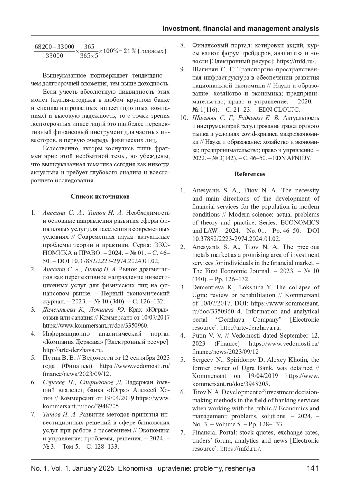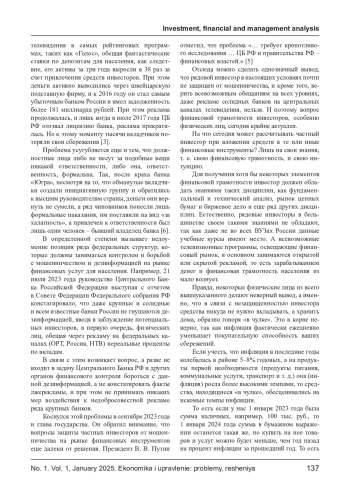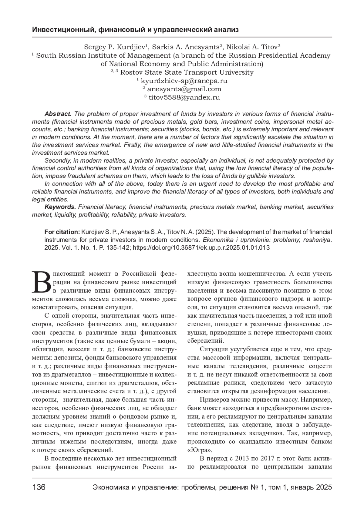 КЮРДЖИЕВ С. П., АНЕСЯНЦ С. А., ТИТОВ Н. А. РАЗВИТИЕ РЫНКА ФИНАНСОВЫХ ИНСТРУМЕНТОВ ДЛЯ ЧАСТНЫХ ИНВЕСТОРОВ В СОВРЕМЕННЫХ УСЛОВИЯХ // ЭКОНОМИКА И УПРАВЛЕНИЕ: ПРОБЛЕМЫ, РЕШЕНИЯ. 2025. ТОМ 1 № 1