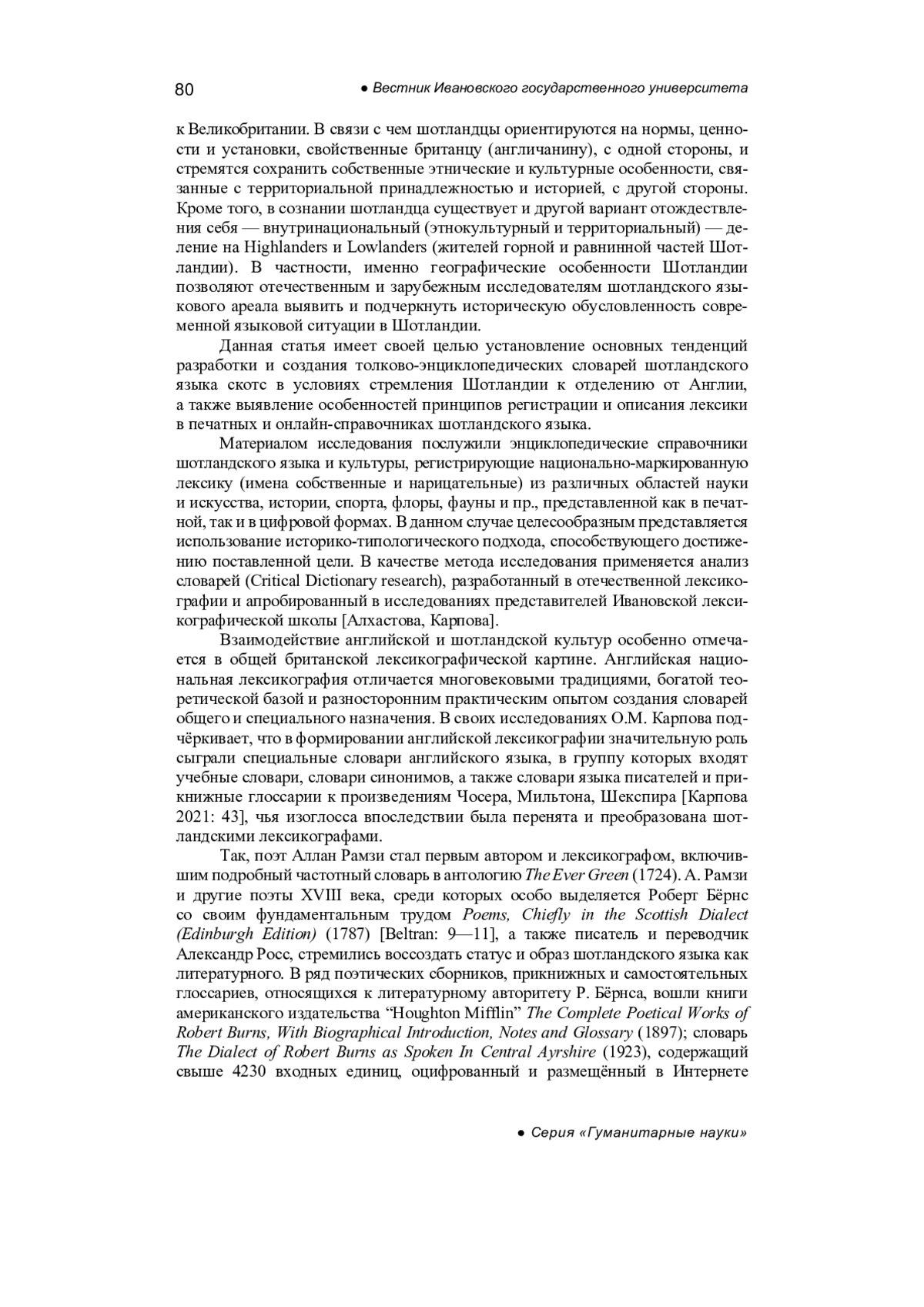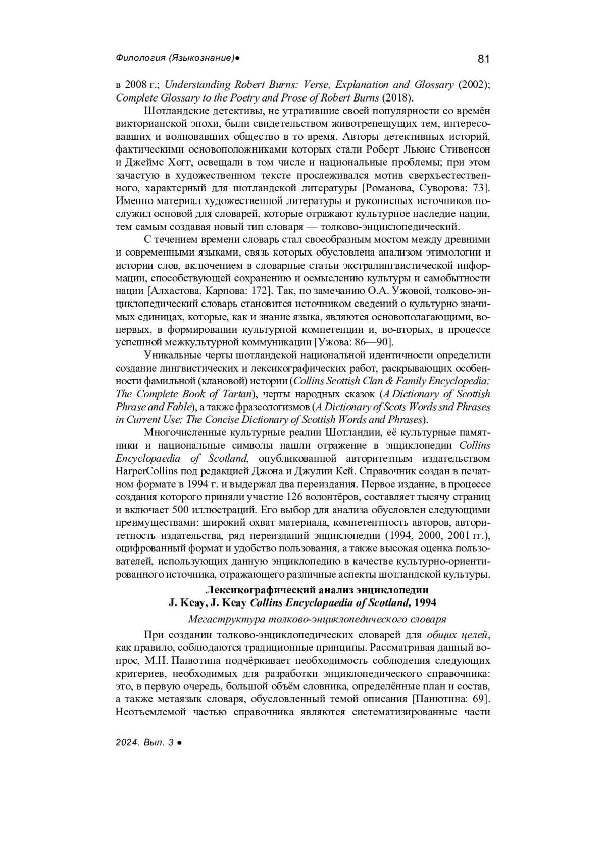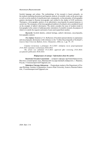 В статье анализируется роль справочников шотландского языка в процессе сохранения национального языка и национальной культуры Шотландии в условиях всемирной глобализации и цифровизации. Уникальный исторический опыт и реалии, которыми богата Шотландия, находят своё проявление в шотландском языке, традиция описания которого ведется английской лексикографией с прикнижных глоссариев. В этой связи проводится лексикографический анализ авторитетной энциклопедии для общих целей. Рассматривается вопрос о предпосылках возникновения лексикографической традиции в Шотландии на примере словарей языка писателей как источника культурно-языкового авторитета. Поднимается вопрос о современных тенденциях разработки структуры словарей и справочников шотландского языка в контексте антропоцентрической направленности научных исследований, целью которой является удовлетворение запросов и нужд пользователей. Отмечается возрастающая роль экстралингвистической информации источника, наличие которой расширяет группу целевой аудитории: в ее спектр входят переводчики, специалисты, студенты, туристы и др