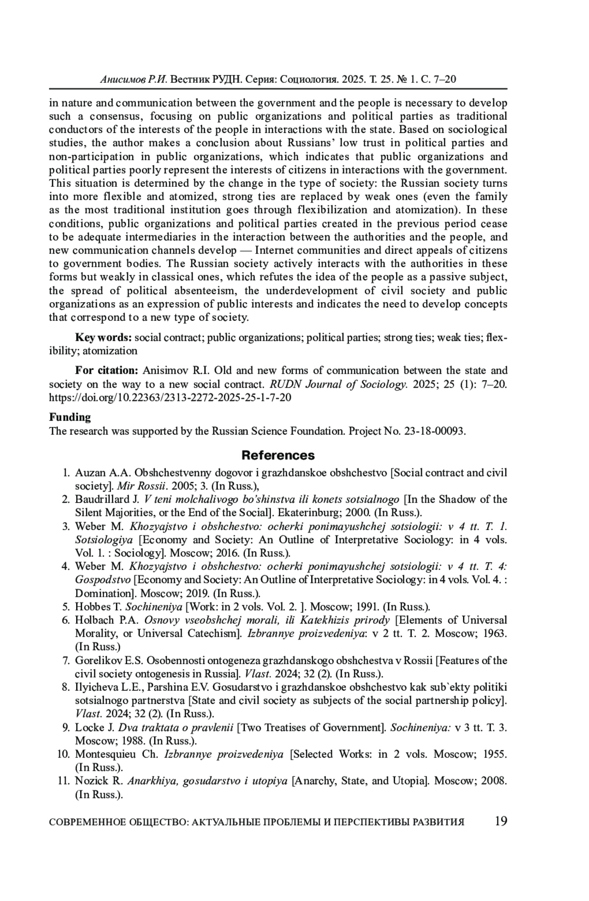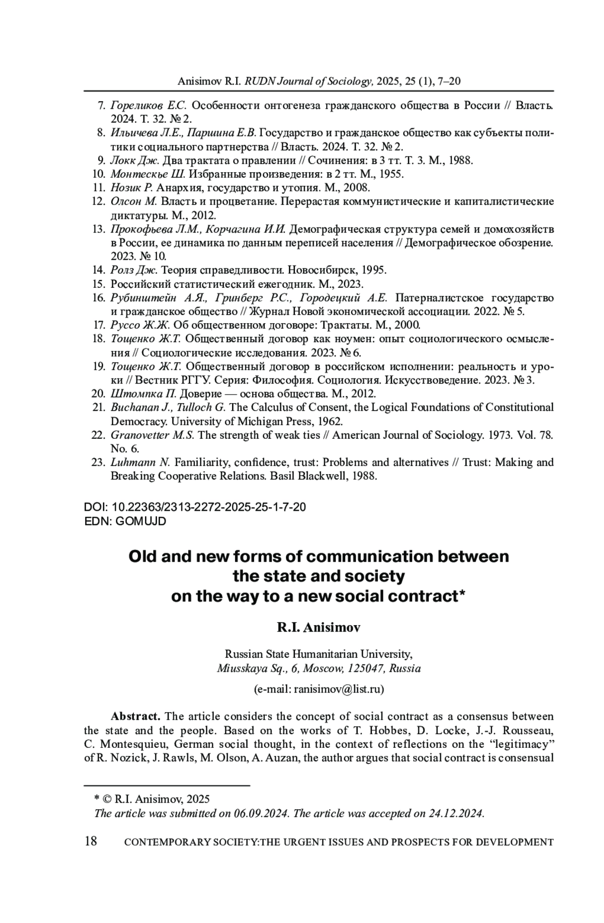 АНИСИМОВ Р. И. ПРЕЖНИЕ И НОВЫЕ ФОРМЫ КОММУНИКАЦИИ ВЛАСТИ И ОБЩЕСТВА НА ПУТИ К СОЗДАНИЮ НОВОГО ОБЩЕСТВЕННОГО ДОГОВОРА // ВЕСТНИК РОССИЙСКОГО УНИВЕРСИТЕТА ДРУЖБЫ НАРОДОВ. СЕРИЯ: СОЦИОЛОГИЯ. 2025. Т. 25 № 1