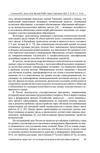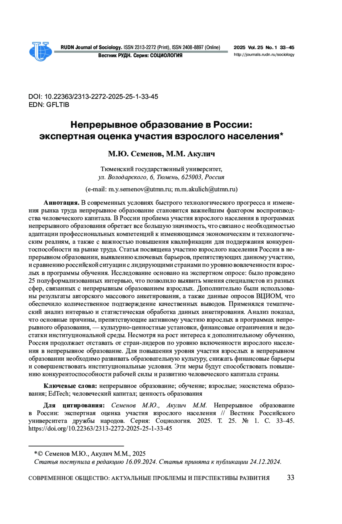В современных условиях быстрого технологического прогресса и изменения рынка труда непрерывное образование становится важнейшим фактором воспроизводства человеческого капитала. В России проблема участия взрослого населения в программах непрерывного образования обретает все большую значимость, что связано с необходимостью адаптации профессиональных компетенций к изменяющимся экономическим и технологическим реалиям, а также с важностью повышения квалификации для поддержания конкурентоспособности на рынке труда. Статья посвящена участию взрослого населения России в непрерывном образовании, выявлению ключевых барьеров, препятствующих данному участию, и сравнению российской ситуации с лидирующими странами по уровню вовлеченности взрослых в программы обучения. Исследование основано на экспертном опросе: было проведено 25 полуформализованных интервью, что позволило выявить мнения специалистов из разных сфер, связанных с непрерывным образованием взрослых. Дополнительно были использованы результаты авторского массового анкетирования, а также данные опросов ВЦИОМ, что обеспечило количественное подтверждение качественных выводов. Применялся тематический анализ интервью и статистическая обработка данных анкетирования. Анализ показал, что основные причины, препятствующие активному участию взрослых в программах непрерывного образования, - культурно-ценностные установки, финансовые ограничения и недостатки институциональной среды. Несмотря на рост интереса к дополнительному обучению, Россия продолжает отставать от стран-лидеров по уровню включенности взрослого населения в непрерывное образование. Для повышения уровня участия взрослых в непрерывном образовании необходимо развивать образовательную культуру, снижать финансовые барьеры и совершенствовать институциональные условия. Эти меры будут способствовать повышению конкурентоспособности рабочей силы и развитию человеческого капитала страны.