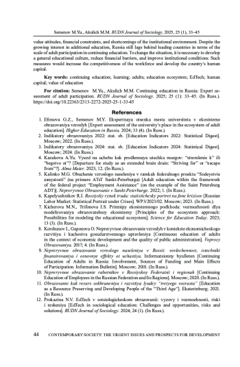 1. Ефимова Г.З., Семенов М.Ю. Экспертная оценка места университета в экосистеме образования взрослых // Высшее образование в России. 2024. Т. 33. № 4. EDN: LBVHFT