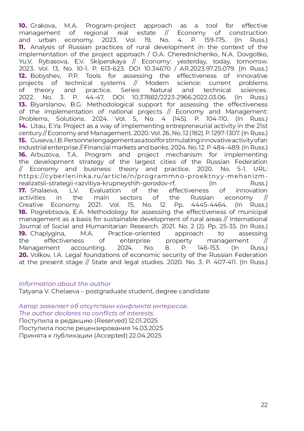 13. Биярсланов Б.Г. Методологическое обеспечение оценки эффективности реализации национальных проектов // Экономика и управление: проблемы, решения. 2024. Т. 5, № 4(145). С. 104-110.