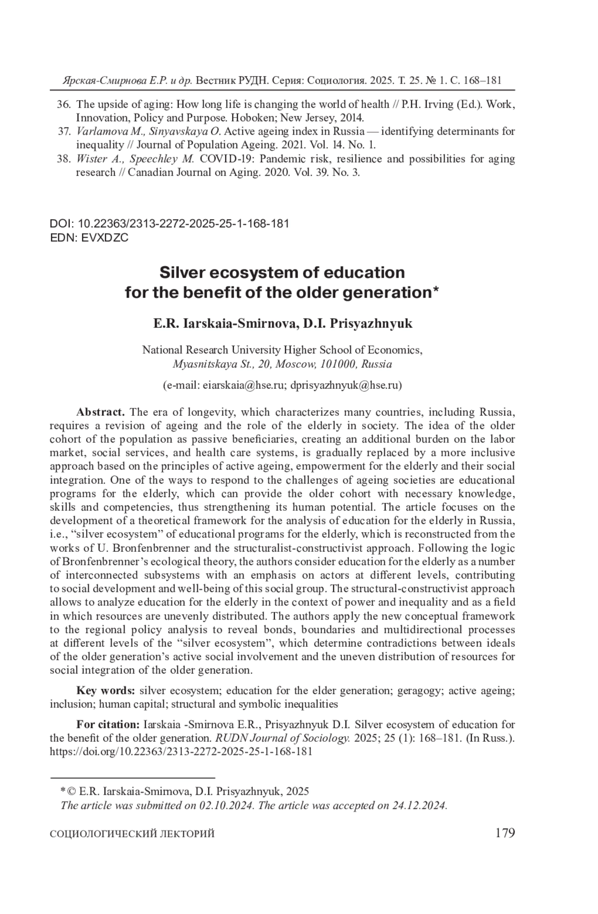 ЯРСКАЯ-СМИРНОВА Е. Р., ПРИСЯЖНЮК Д. И. СЕРЕБРЯНАЯ ЭКОСИСТЕМА ОБРАЗОВАНИЯ В ИНТЕРЕСАХ СТАРШЕГО ПОКОЛЕНИЯ // ВЕСТНИК РОССИЙСКОГО УНИВЕРСИТЕТА ДРУЖБЫ НАРОДОВ. СЕРИЯ: СОЦИОЛОГИЯ. 2025. Т. 25 № 1