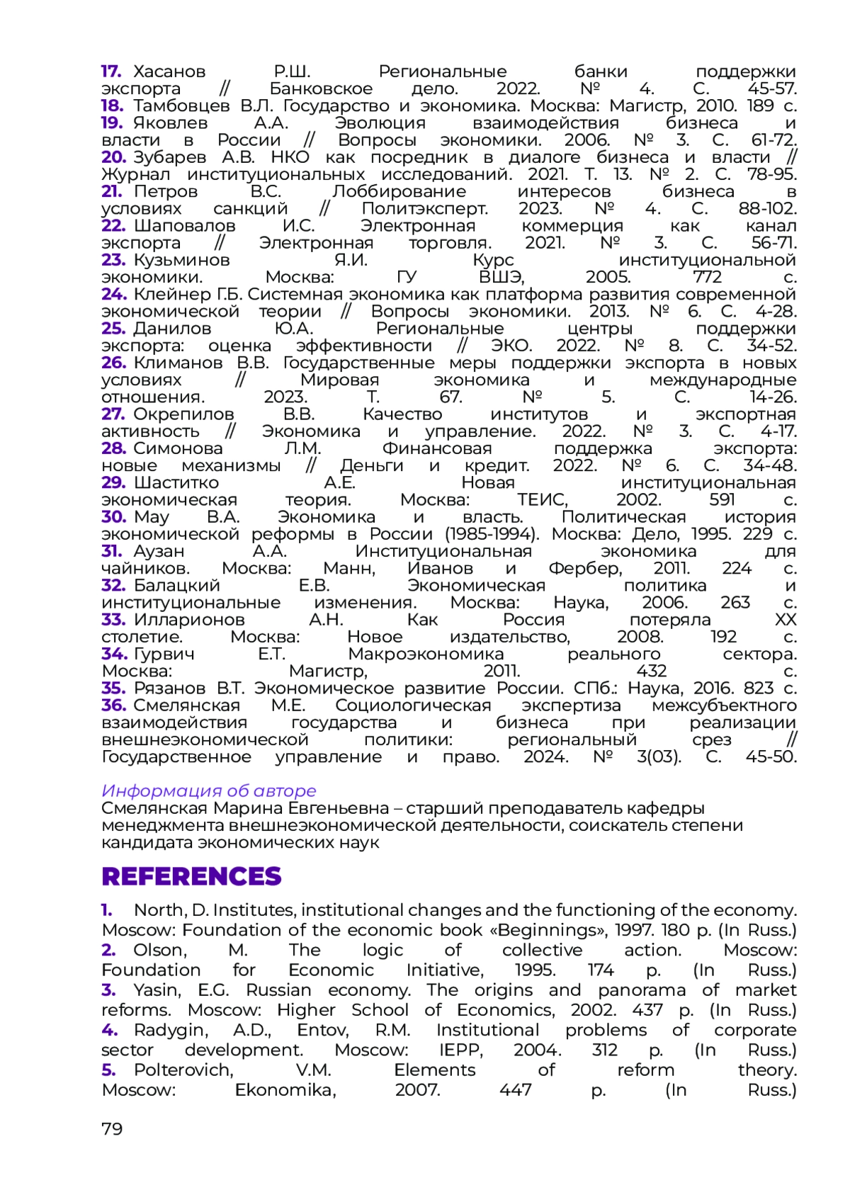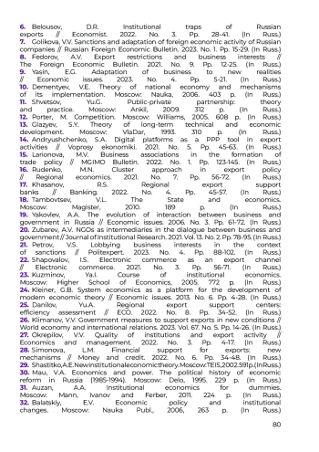 42. Belousov, D.R. Institutional traps of Russian exports // Economist. 2022. No. 3. Pp. 28-41. (In Russ.).