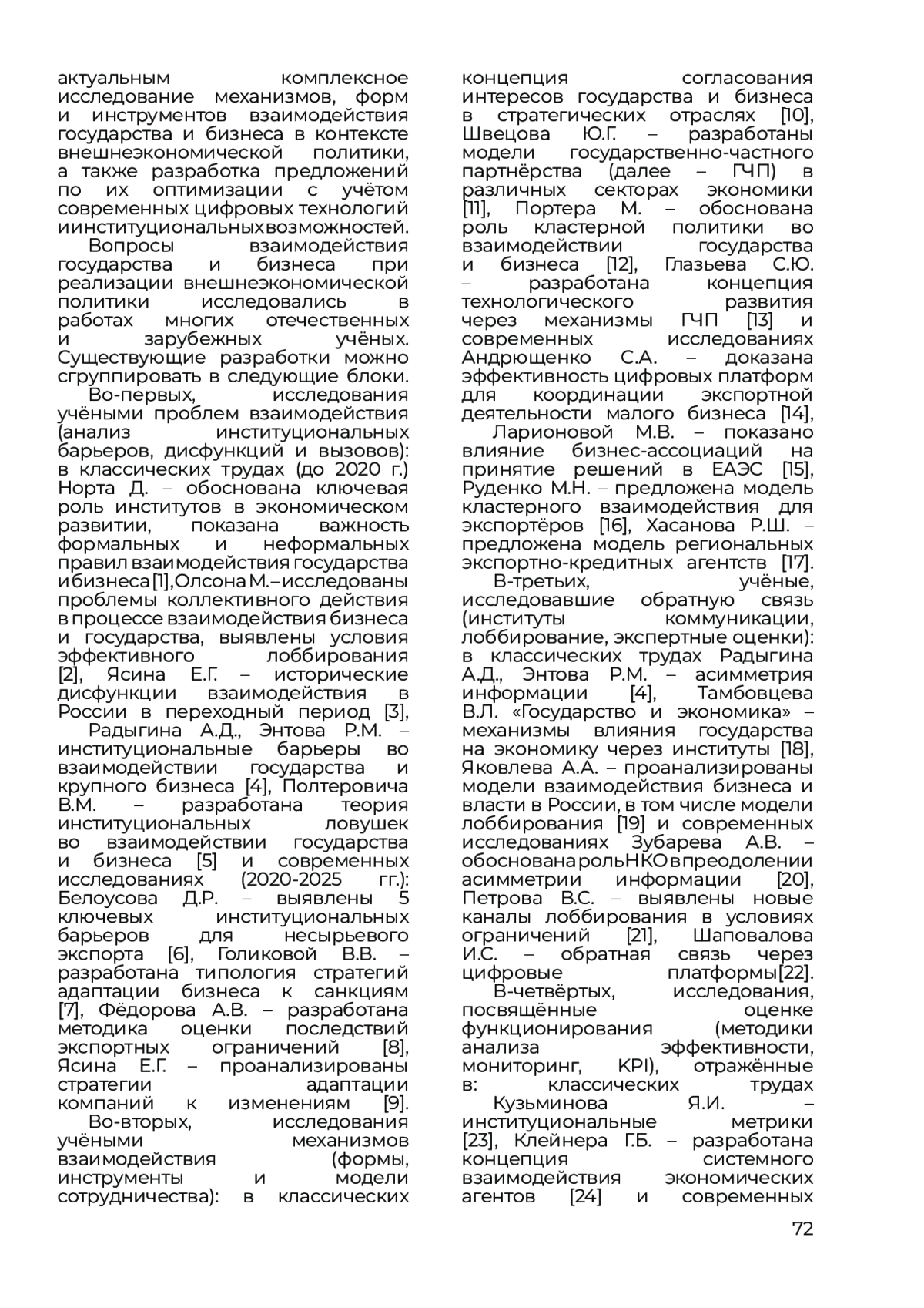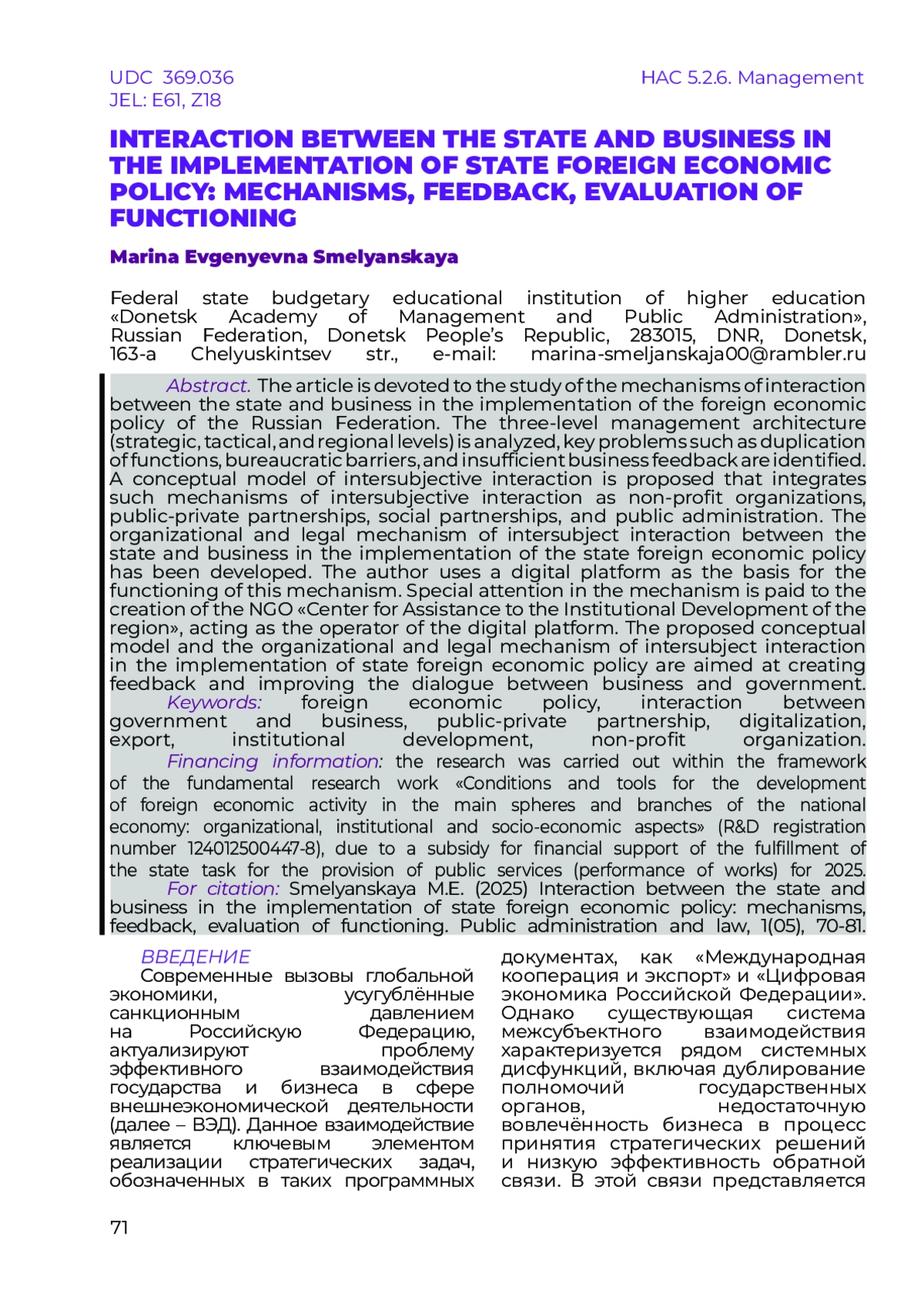 72. Smelyanskaya, M.E., Naumenko, S.N. Sociological examination of intersubjective interaction between the state and business in the implementation of foreign economic policy: regional section // Public administration and law. 2024. № 3(03). Pp. 45-50. (In Russ.).