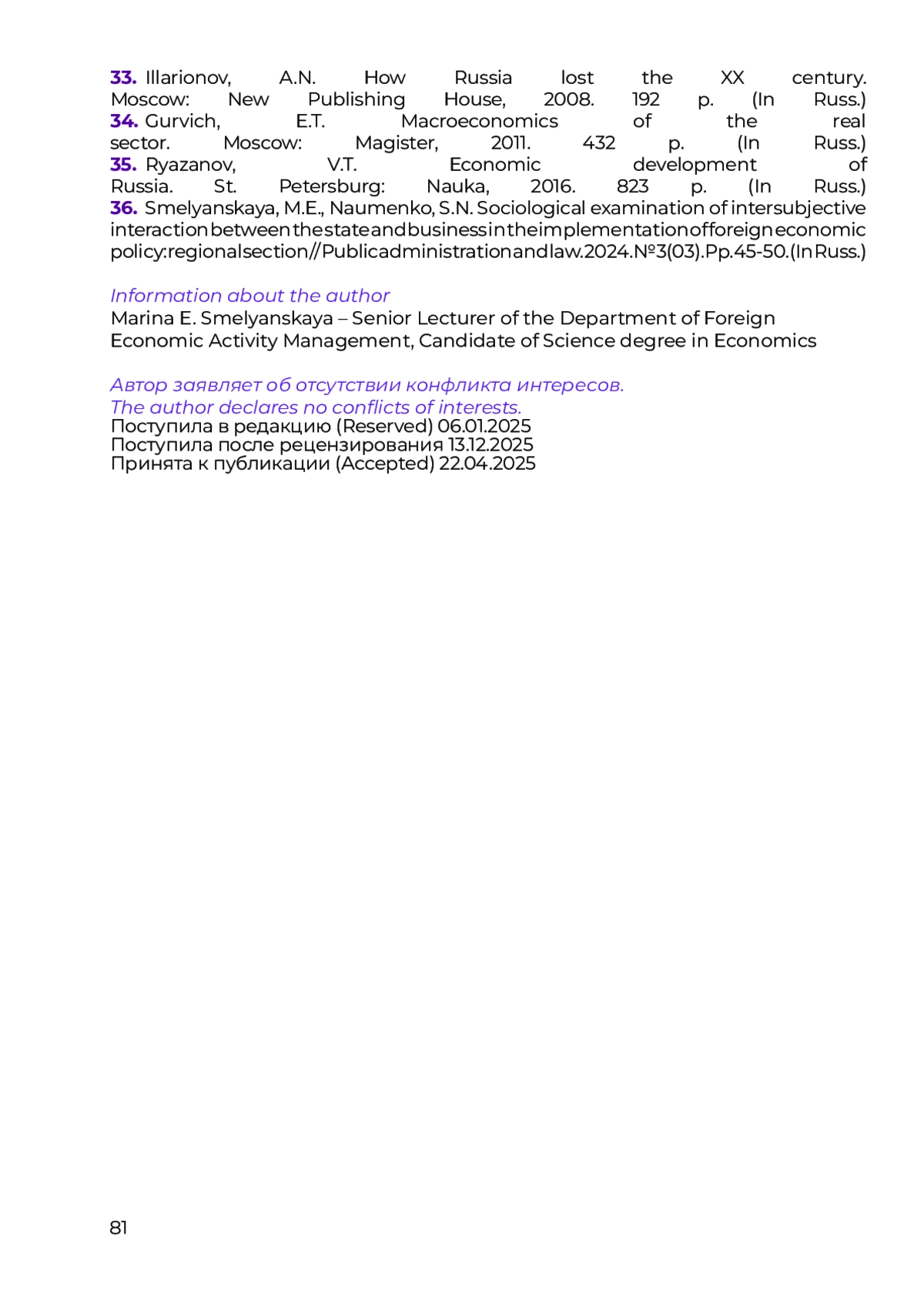 36. Смелянская М.Е. Социологическая экспертиза межсубъектного взаимодействия государства и бизнеса при реализации внешнеэкономической политики: региональный срез // Государственное управление и право. 2024. № 3(03). С. 45-50.
