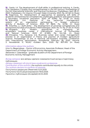 В статье исследуется трансформация компетенций специалистов в области международных отношений в условиях динамичных изменений политической и экономической среды на глобальном уровне. В условиях современных вызовов, таких как геополитические конфликты, экономические санкции и технологические инновации, становится особенно актуальным развитие навыков, необходимых для успешной профессиональной деятельности. Анализируются ключевые компетенции, включая аналитическое мышление, межкультурную коммуникацию, освоение новейших технологий и гибкость в адаптации к изменениям. Особое внимание уделяется значению soft skills, таких как эмоциональный интеллект, командная работа и креативность, которые становятся неотъемлемой частью профессионального арсенала специалистов-международников. В статье представлена авторская классификация этих навыков, что позволяет систематизировать подходы к их развитию. Также предложена модель подготовки специалистов, учитывающая современные вызовы и тенденции, а также конкретные рекомендации по улучшению образовательных программ и тренингов. Статья подчёркивает важность регулярного профессионального развития и готовности к изменениям как критически важных факторов для успешной карьеры в сфере международных отношений, что, в свою очередь, способствует повышению конкурентоспособности выпускников на рынке труда. Результаты исследования подчёркивают необходимость интеграции новых подходов в образовательные программы, чтобы подготовить специалистов, способных эффективно реагировать на вызовы и изменения в глобальной среде.