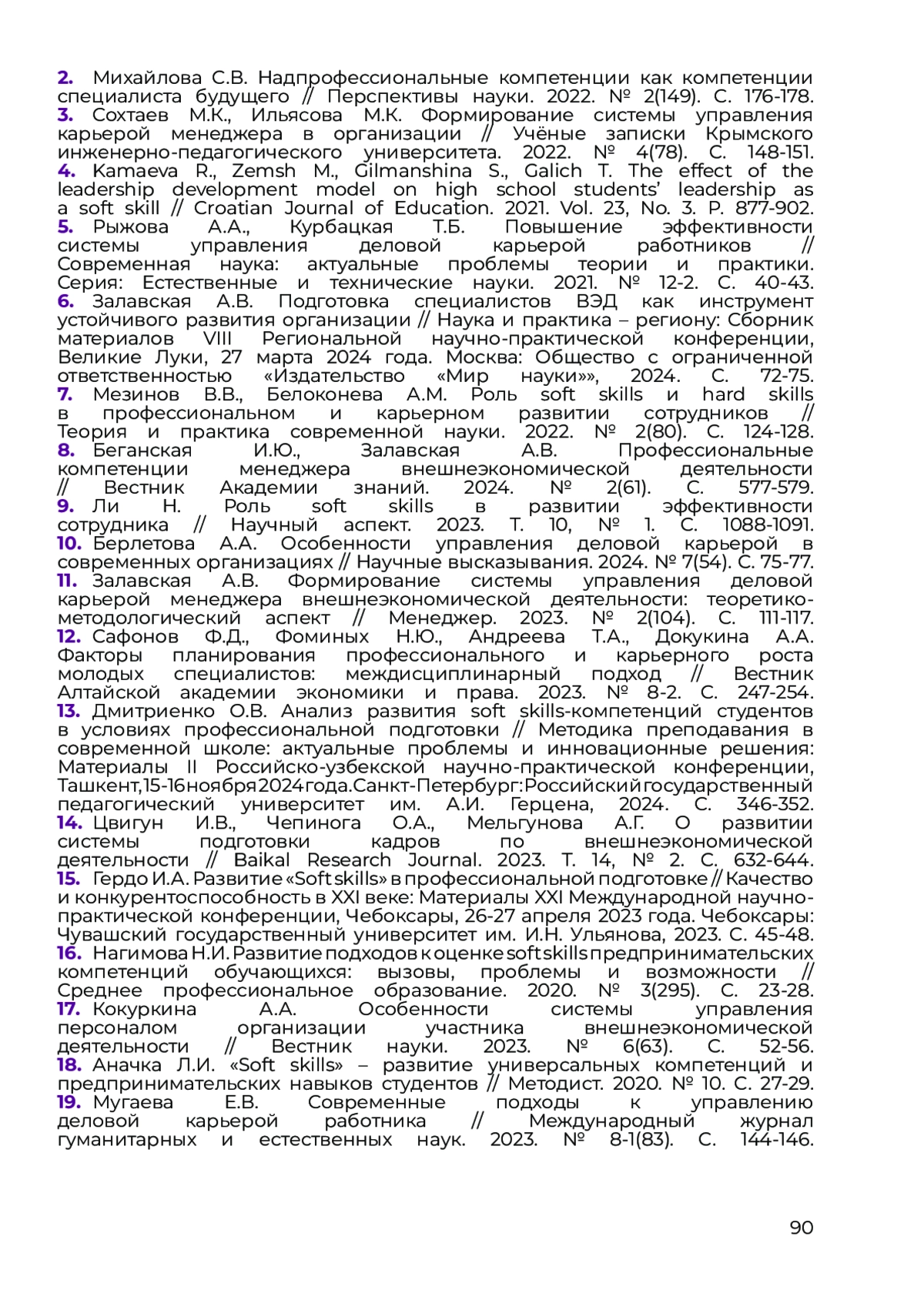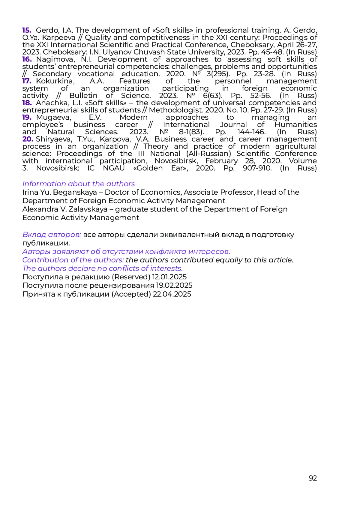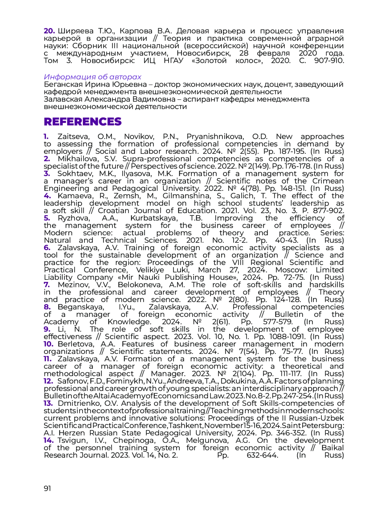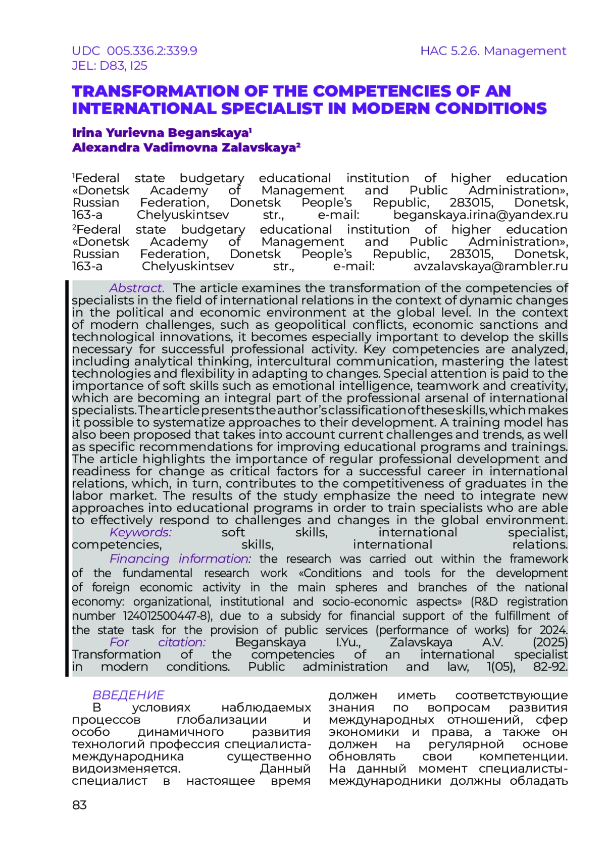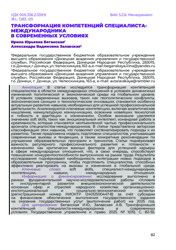 БЕГАНСКАЯ И. Ю., ЗАЛАВСКАЯ А. В. ТРАНСФОРМАЦИЯ КОМПЕТЕНЦИЙ СПЕЦИАЛИСТА-МЕЖДУНАРОДНИКА В СОВРЕМЕННЫХ УСЛОВИЯХ // НАУЧНЫЙ ЖУРНАЛ "ГОСУДАРСТВЕННОЕ УПРАВЛЕНИЕ И ПРАВО". 2025. № 1 (5)