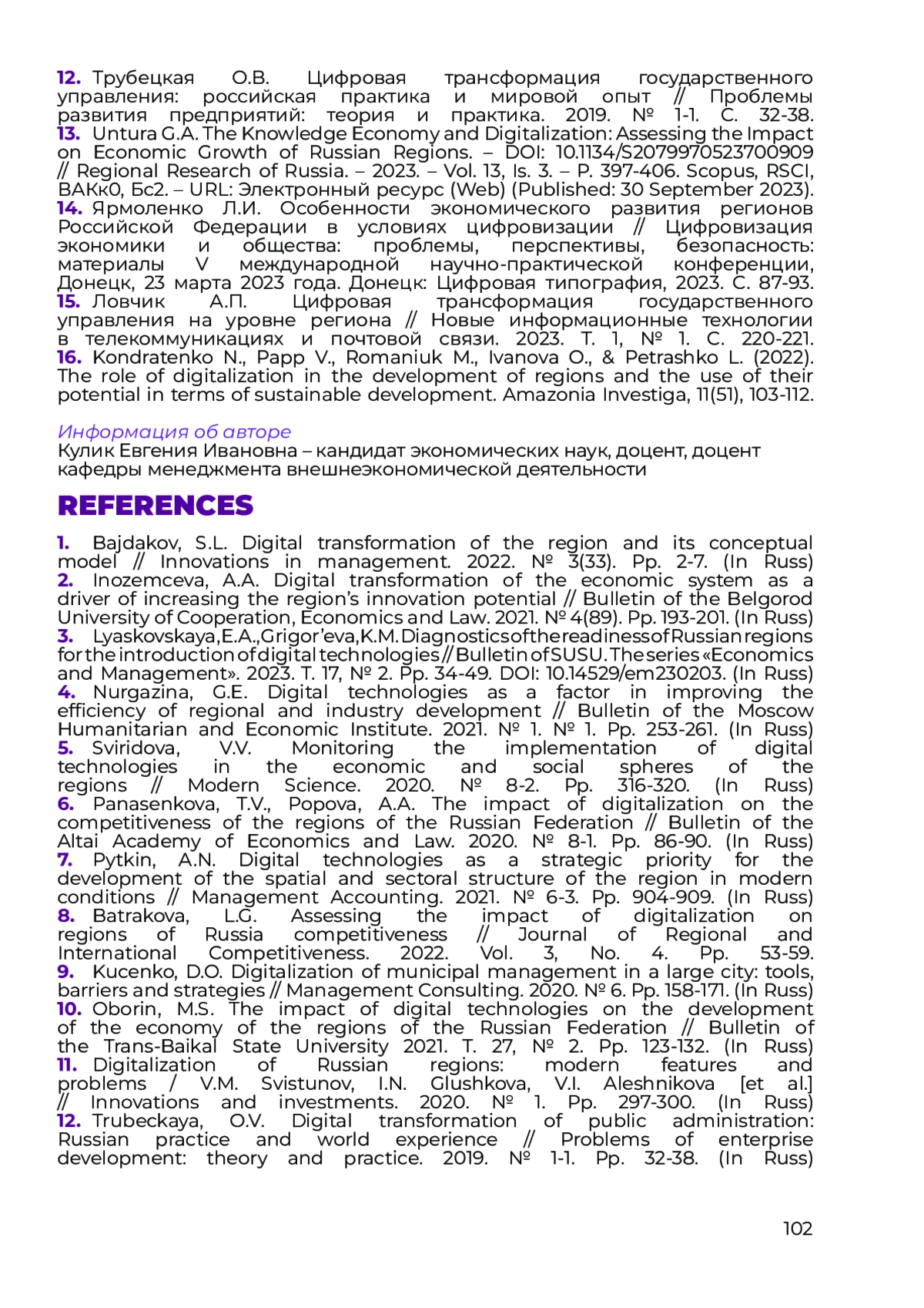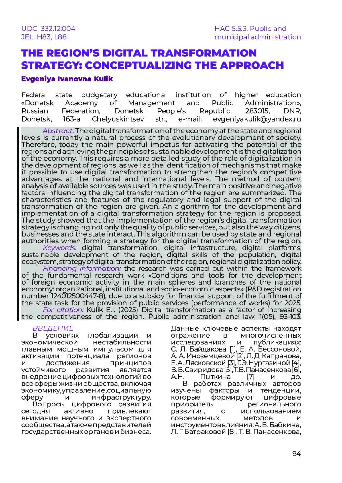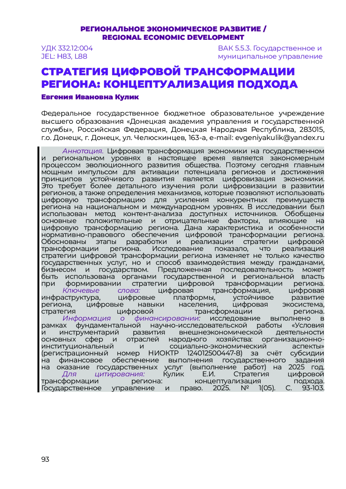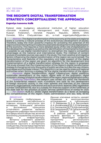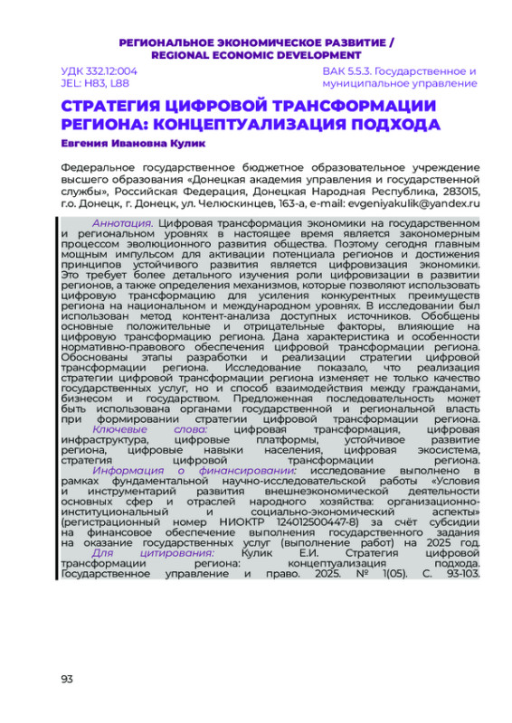 КУЛИК Е. И. СТРАТЕГИЯ ЦИФРОВОЙ ТРАНСФОРМАЦИИ РЕГИОНА: КОНЦЕПТУАЛИЗАЦИЯ ПОДХОДА // НАУЧНЫЙ ЖУРНАЛ "ГОСУДАРСТВЕННОЕ УПРАВЛЕНИЕ И ПРАВО". 2025. № 1 (5)