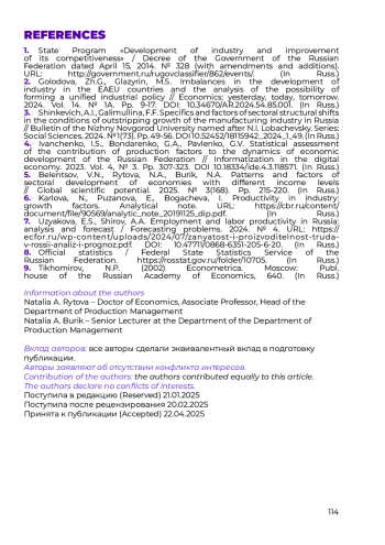 15. Karlova, N., Puzanova, E., Bogacheva, I. Productivity in industry: growth factors. Analytical note. URL: https://cbr.ru/content/document/file/90569/analytic_note_20191125_dip.pdf.(In Russ.).