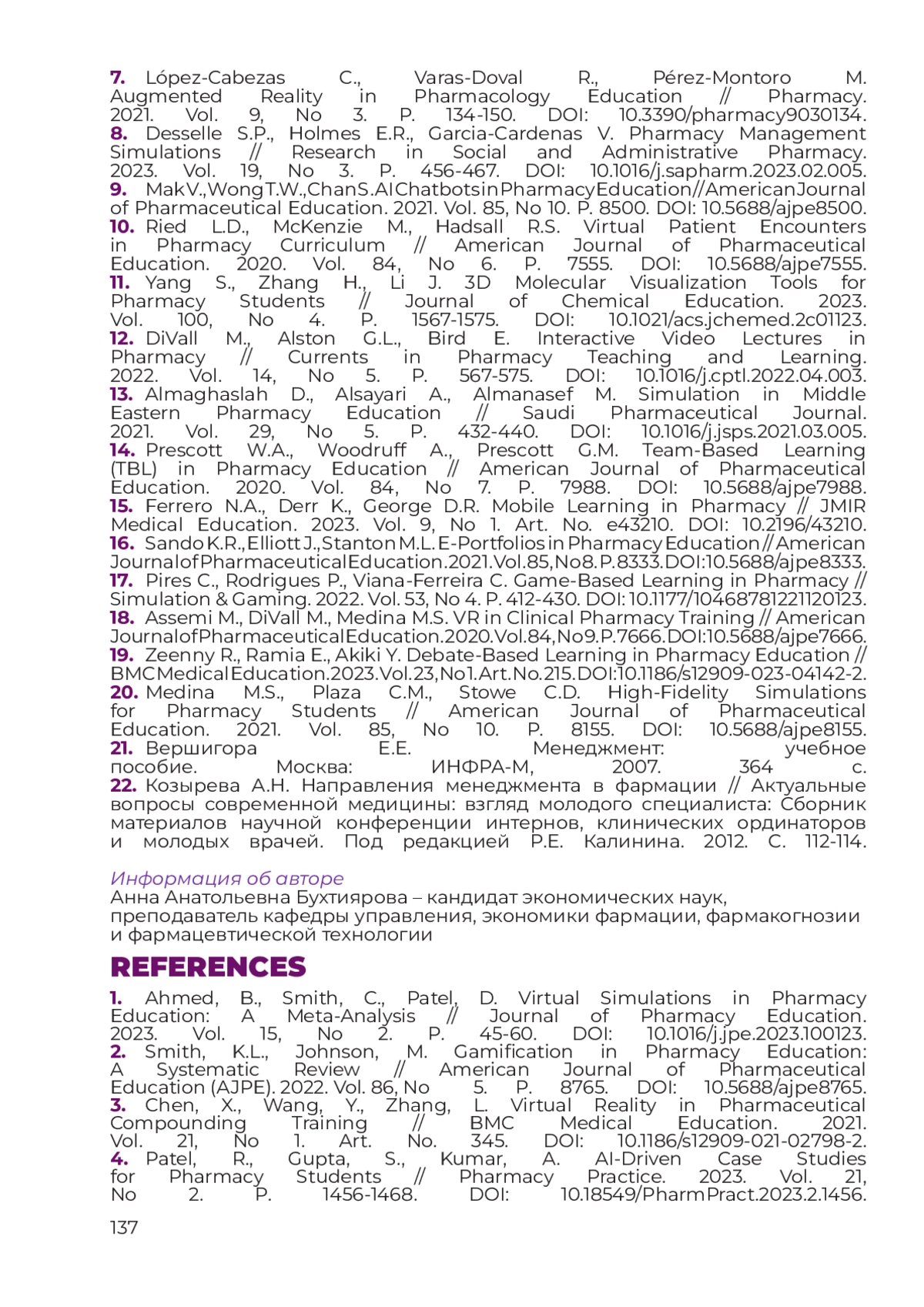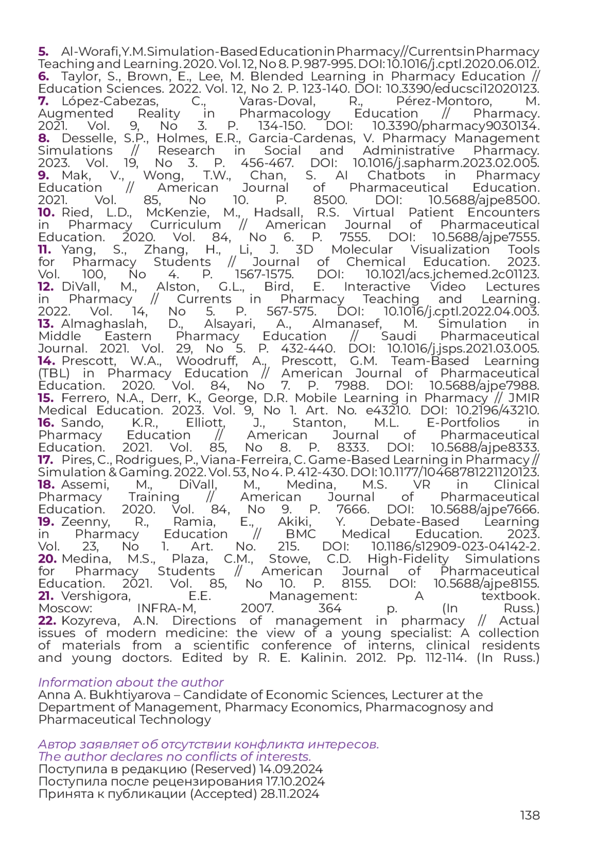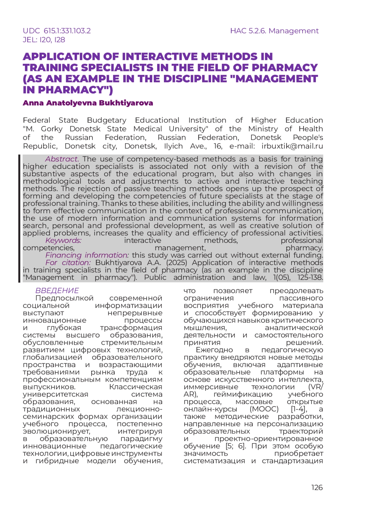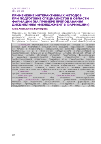 БУХТИЯРОВА А. А. ПРИМЕНЕНИЕ ИНТЕРАКТИВНЫХ МЕТОДОВ ПРИ ПОДГОТОВКЕ СПЕЦИАЛИСТОВ В ОБЛАСТИ ФАРМАЦИИ (НА ПРИМЕРЕ ПРЕПОДАВАНИЯ ДИСЦИПЛИНЫ «МЕНЕДЖМЕНТ В ФАРМАЦИИ») // НАУЧНЫЙ ЖУРНАЛ "ГОСУДАРСТВЕННОЕ УПРАВЛЕНИЕ И ПРАВО". 2025. № 1 (5)
