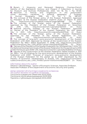 11. Byram, J. Museums and Renewed Relations: Choctaw-French Nations of the Eighteenth Century and Present // Collections: A Journal for Museum and Archives Professionals. 2022. Vol. 18, No. 1. Pр. 59-68.