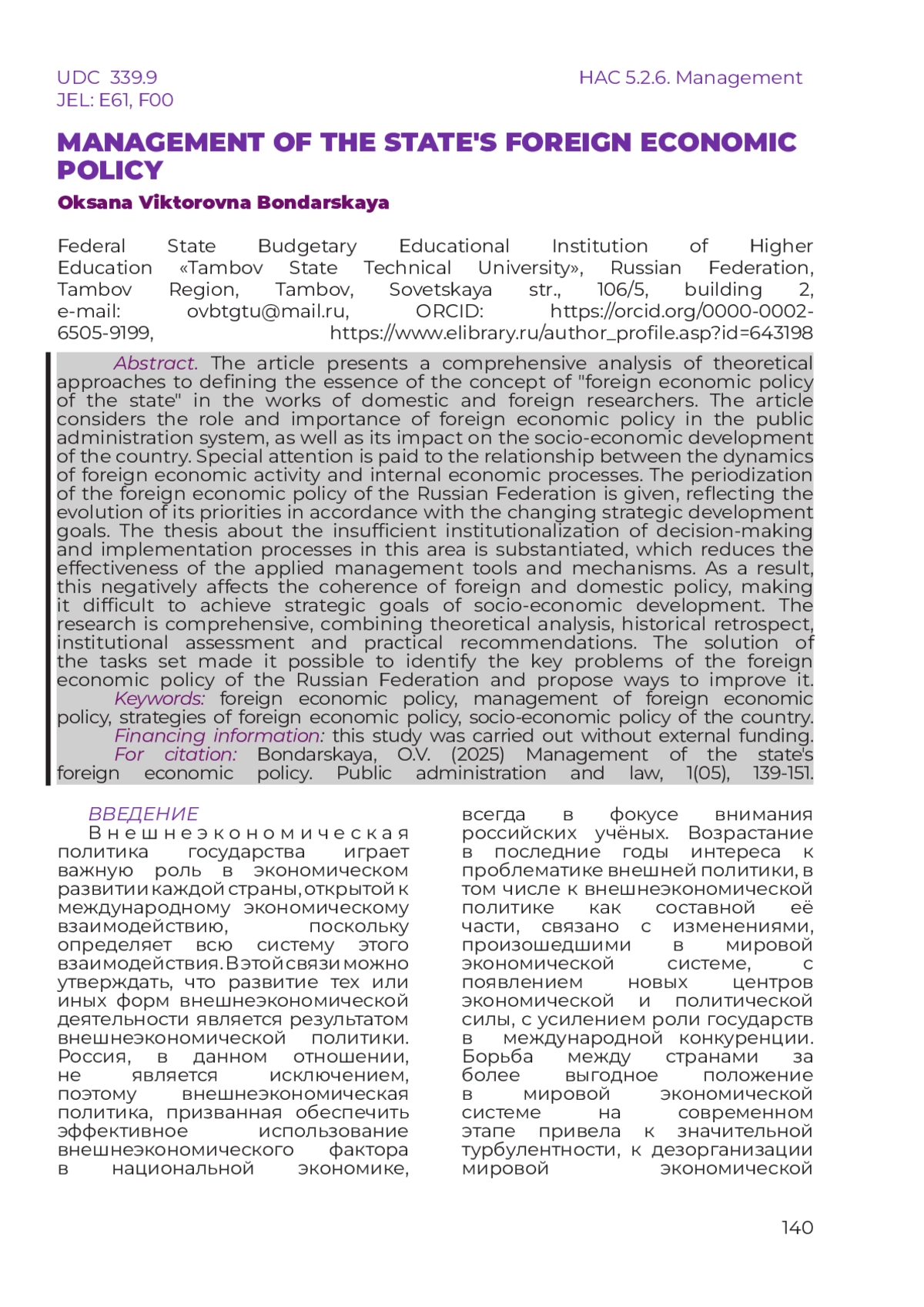 В статье представлен комплексный анализ теоретических подходов к определению сущности понятия «внешнеэкономическая политика государства» в трудах отечественных и зарубежных исследователей. Рассматривается роль и значение внешнеэкономической политики в системе государственного управления, а также её влияние на социально-экономическое развитие страны. Особое внимание уделено взаимосвязи между динамикой внешнеэкономической деятельности и внутренними экономическими процессами. Приведена периодизация внешнеэкономической политики Российской Федерации, отражающая эволюцию её приоритетов в соответствии с изменяющимися стратегическими целями развития. Обоснован тезис о недостаточной институционализации процессов принятия и реализации решений в данной сфере, что снижает эффективность применяемых инструментов и механизмов управления. В результате, это негативно сказывается на согласованности внешней и внутренней политики, затрудняя достижение стратегических задач социально-экономического развития. Исследование носит комплексный характер, сочетая теоретический анализ, историческую ретроспективу, институциональную оценку и практические рекомендации. Решение поставленных задач позволило выявить ключевые проблемы внешнеэкономической политики РФ и предложить направления её совершенствования.