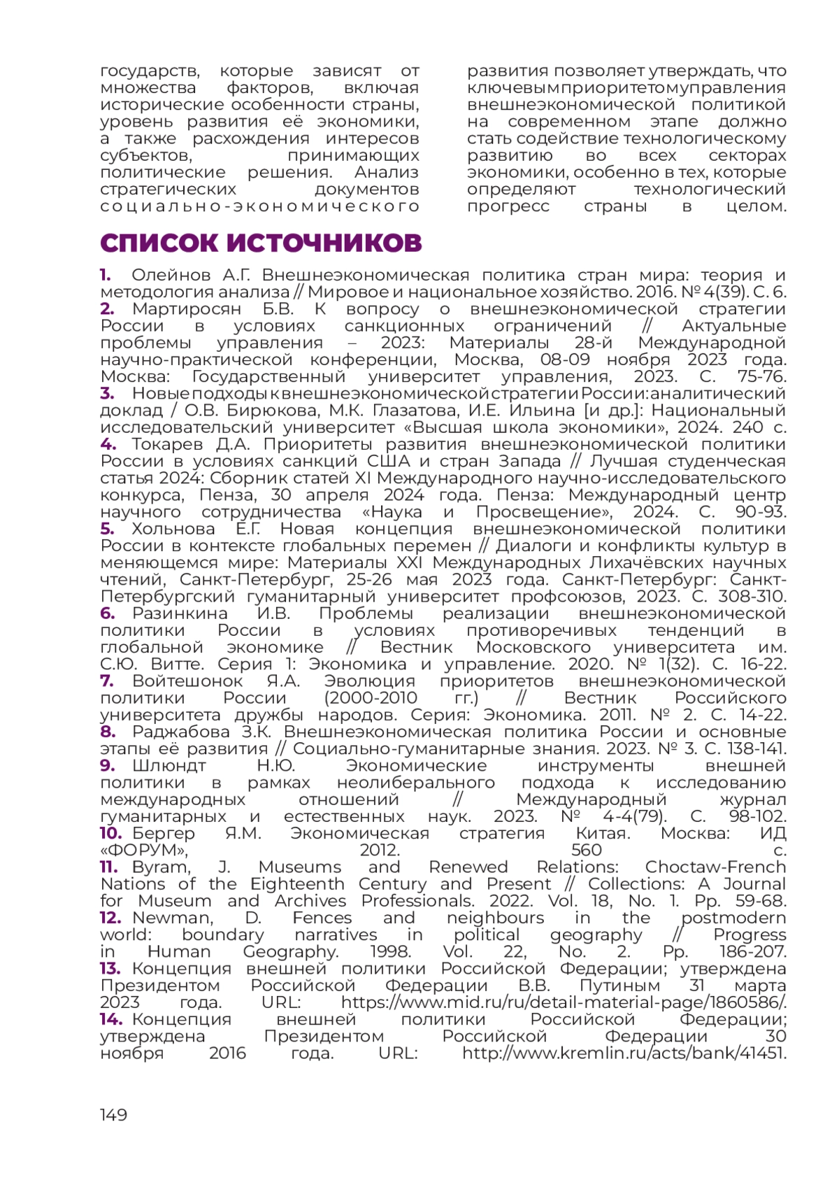 24. Kholnova, E.G. A new concept of Russia’s foreign economic policy in the context of global changes // Dialogues and conflicts of cultures in a changing world: Proceedings of the XXI International Likhachev Scientific Readings, St. Petersburg, May 25-26, 2023. Saint Petersburg: Saint Petersburg University of the Humanities of Trade Unions, 2023. Pp. 308-310. (In Russ.).