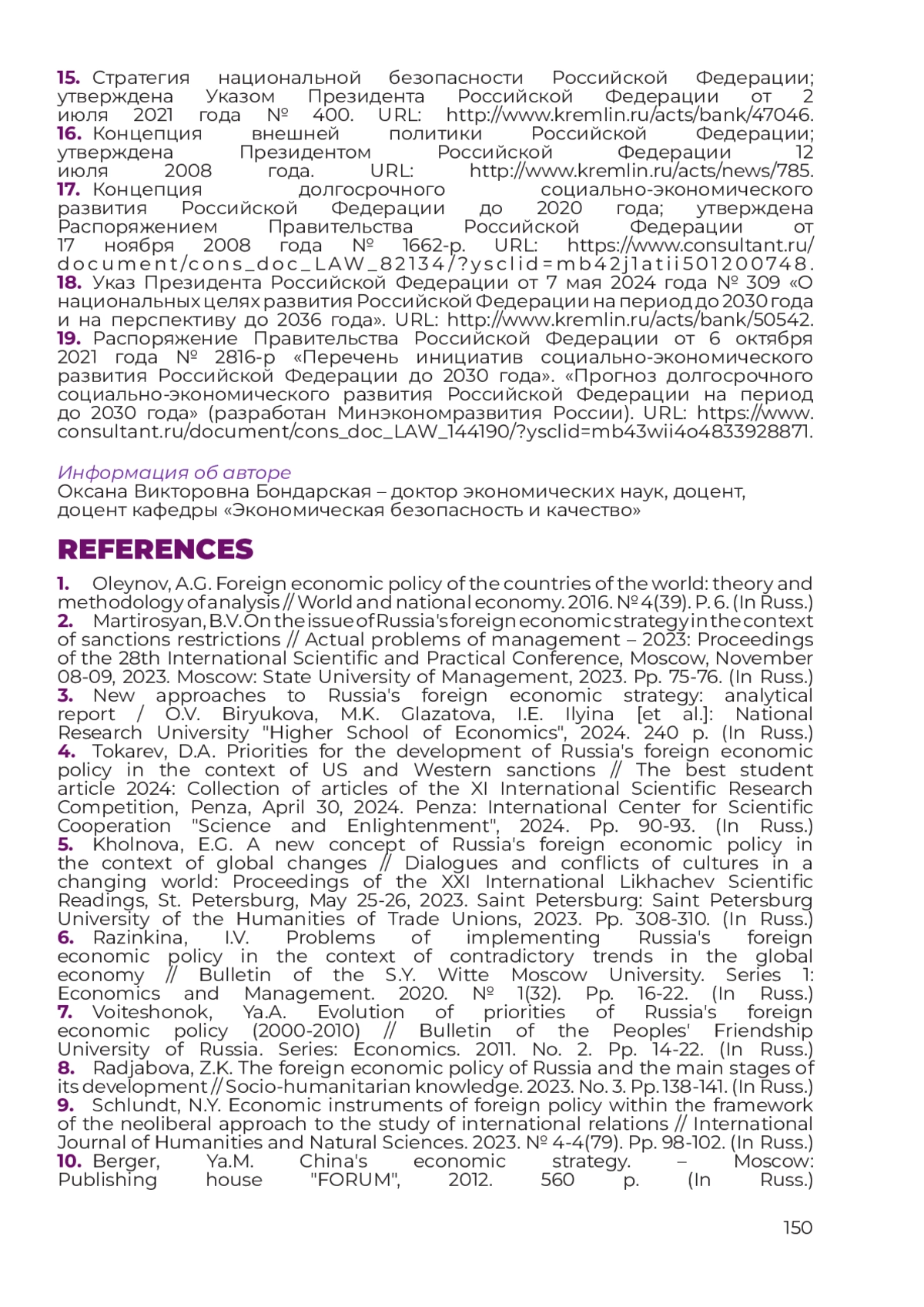 26. Voiteshonok, Ya.A. Evolution of priorities of Russia’s foreign economic policy (2000-2010) // Bulletin of the Peoples’ Friendship University of Russia. Series: Economics. 2011. No. 2. Pp. 14-22. (In Russ.).