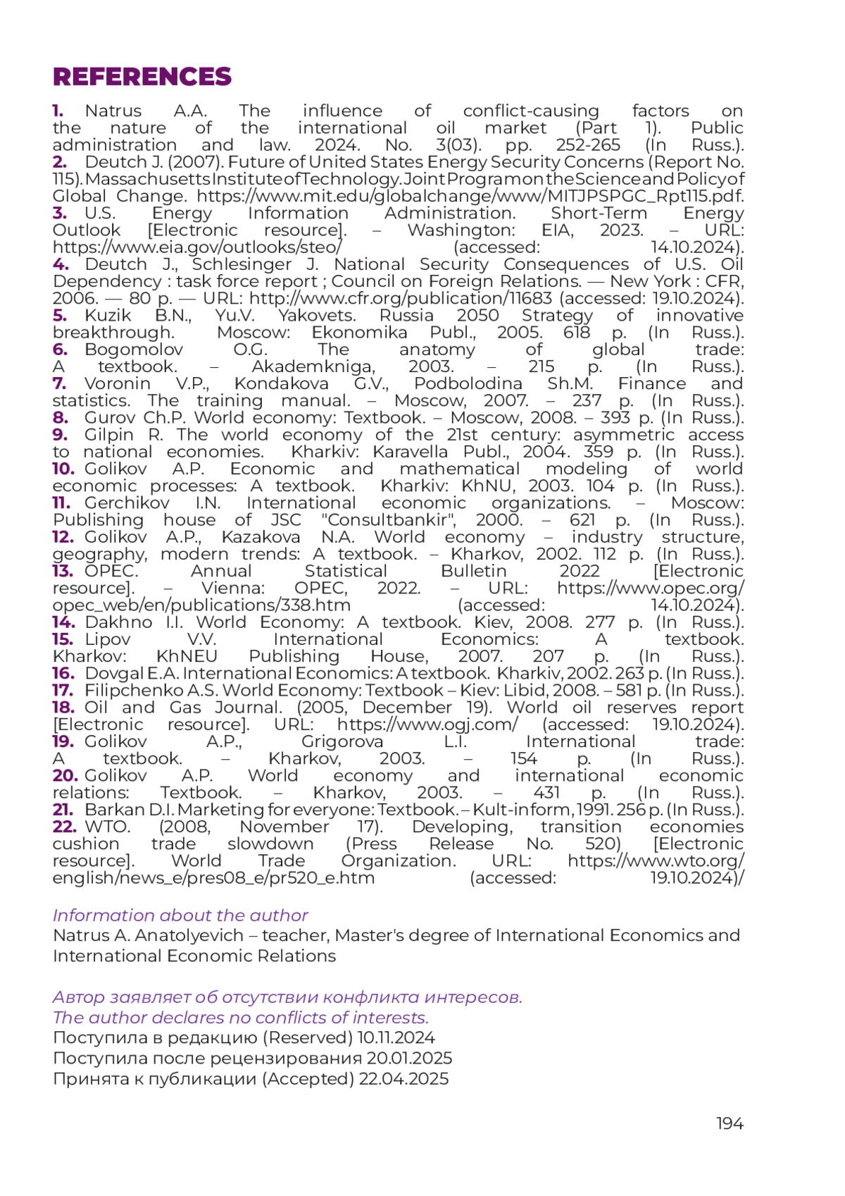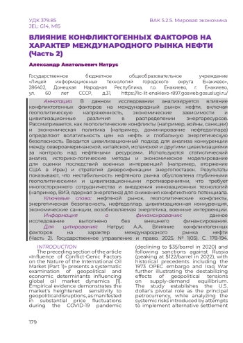 1. Натрус А.А. Влияние конфликтогенных факторов на характер международного рынка нефти (Часть 1). Государственное управление и право. 2024. № 3(03). С. 252-265.
