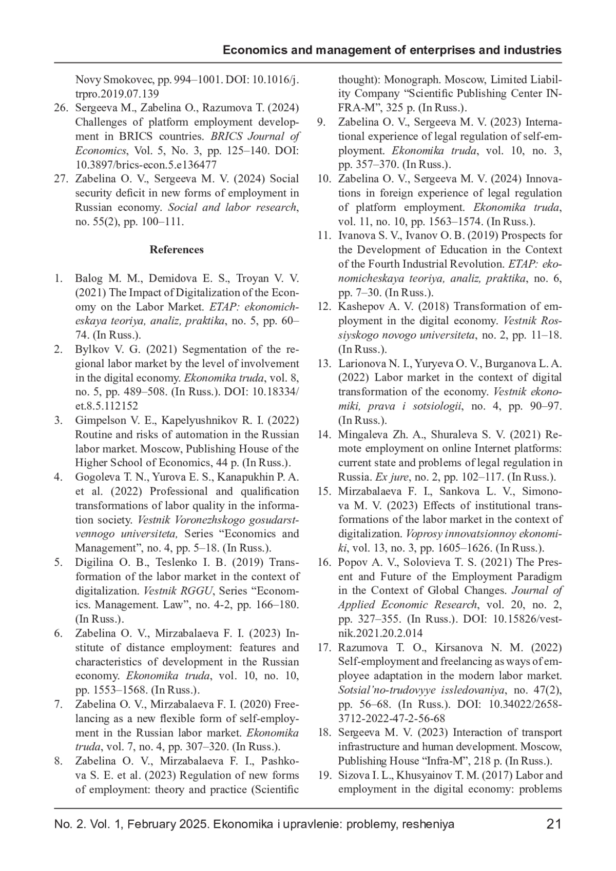 ОМЕЛЬЧЕНКО И. Б., СЕРГЕЕВА М. В., САФОНОВ А. С. ПРОБЛЕМЫ РАЗВИТИЯ РОССИЙСКОГО РЫНКА ТРУДА С ПОЗИЦИИ СТРУКТУРНО-ИНФРАСТРУКТУРНОГО ПОДХОДА // ЭКОНОМИКА И УПРАВЛЕНИЕ: ПРОБЛЕМЫ, РЕШЕНИЯ. 2025. ТОМ 1 № 2
