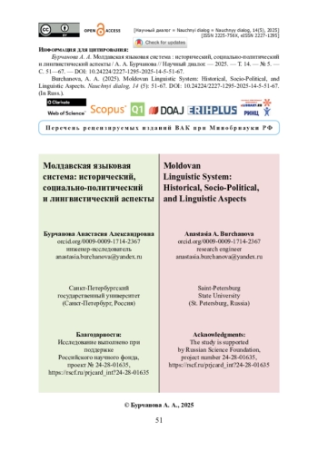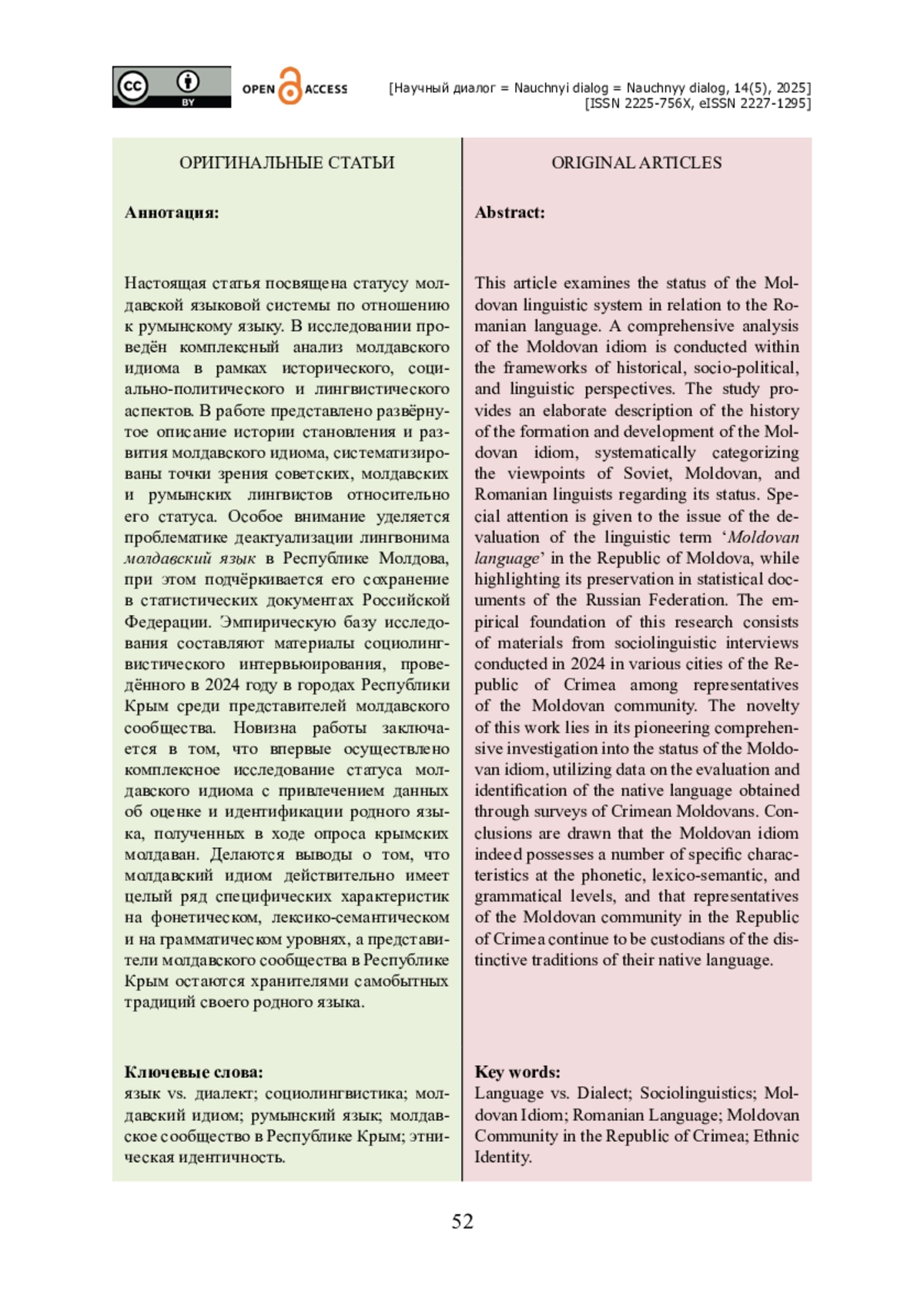 Настоящая статья посвящена статусу молдавской языковой системы по отношению к румынскому языку. В исследовании проведён комплексный анализ молдавского идиома в рамках исторического, социально-политического и лингвистического аспектов. В работе представлено развёрнутое описание истории становления и развития молдавского идиома, систематизированы точки зрения советских, молдавских и румынских лингвистов относительно его статуса. Особое внимание уделяется проблематике деактуализации лингвонима молдавский язык в Республике Молдова, при этом подчёркивается его сохранение в статистических документах Российской Федерации. Эмпирическую базу исследования составляют материалы социолингвистического интервьюирования, проведённого в 2024 году в городах Республики Крым среди представителей молдавского сообщества. Новизна работы заключается в том, что впервые осуществлено комплексное исследование статуса молдавского идиома с привлечением данных об оценке и идентификации родного языка, полученных в ходе опроса крымских молдаван. Делаются выводы о том, что молдавский идиом действительно имеет целый ряд специфических характеристик на фонетическом, лексико-семантическом и на грамматическом уровнях, а представители молдавского сообщества в Республике Крым остаются хранителями самобытных традиций своего родного языка.