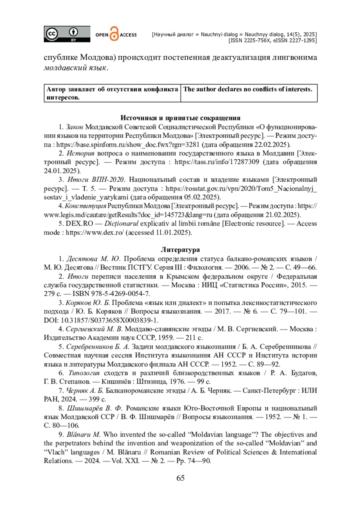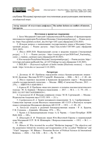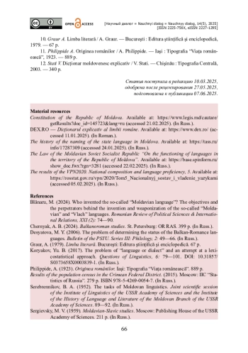 8. Blănaru M. Who invented the so-called “Moldavian language”? The objectives and the perpetrators behind the invention and weaponization of the so-called “Moldavian” and “Vlach” languages / M. Blănaru // Romanian Review of Political Sciences & International Relations. - 2024. - Vol. XXI. - № 2. - Pp. 74-90.