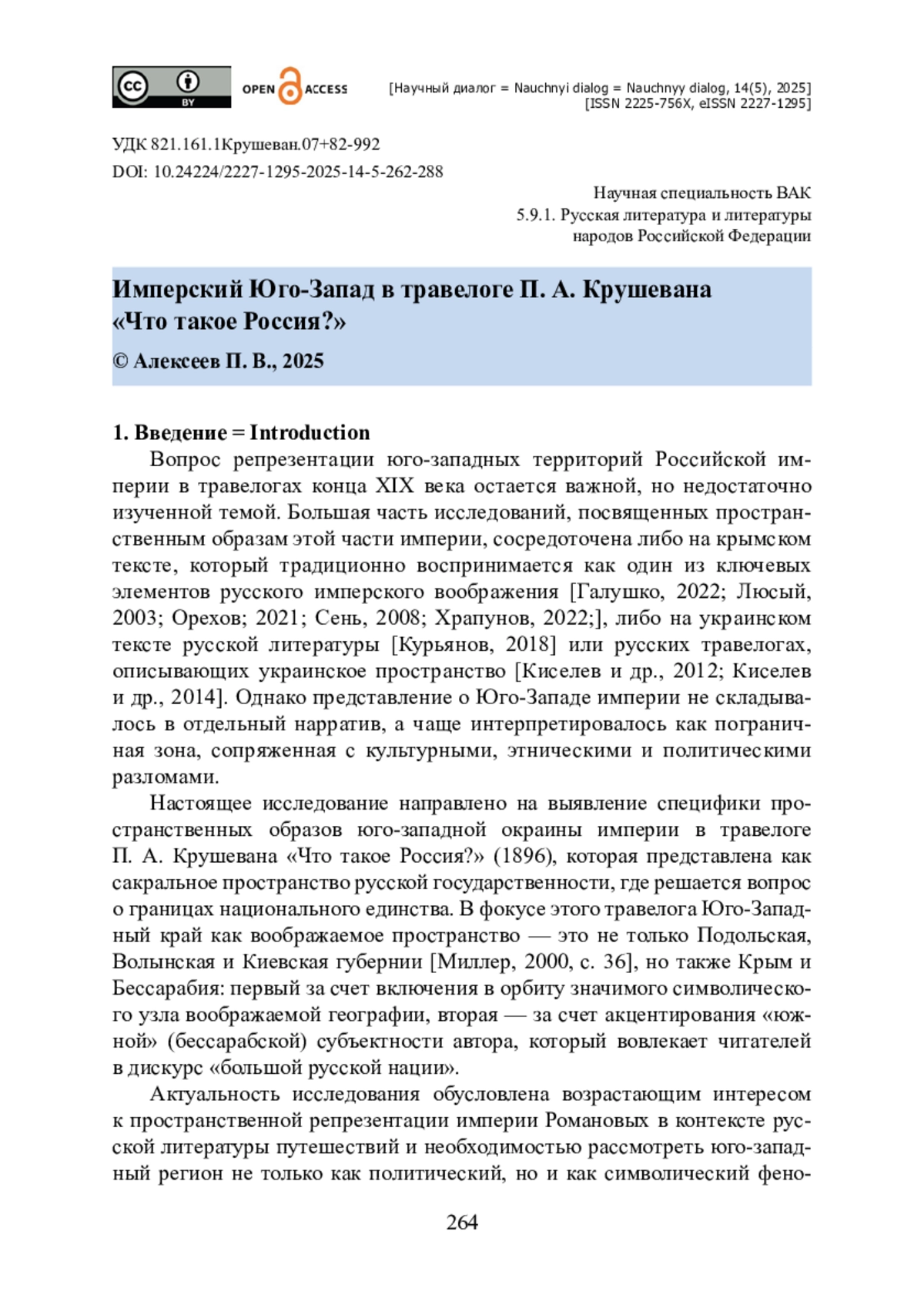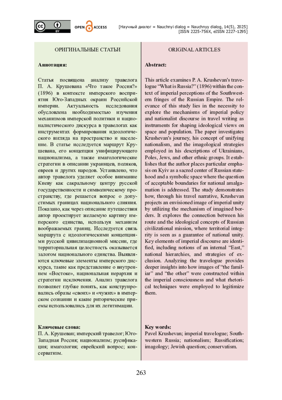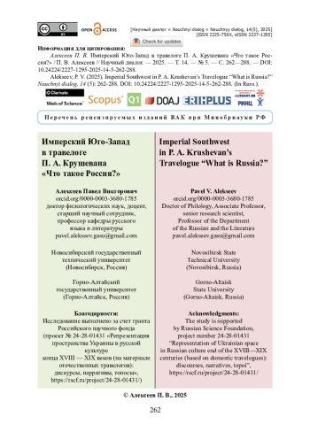 Статья посвящена анализу травелога П. А. Крушевана «Что такое Россия?» (1896) в контексте имперского восприятия Юго-Западных окраин Российской империи. Актуальность исследования обусловлена необходимостью изучения механизмов имперской политики и националистического дискурса в травелогах как инструментах формирования идеологического взгляда на пространство и население. В статье исследуется маршрут Крушевана, его концепция унифицирующего национализма, а также имагологические стратегии в описании украинцев, поляков, евреев и других народов. Устанвлено, что автор травелога уделяет особое внимание Киеву как сакральному центру русской государственности и символическому пространству, где решается вопрос о допустимых границах национального слияния. Показано, как через описание путешествия автор проектирует желаемую картину имперского единства, используя механизм воображаемых границ. Исследуется связь маршрута с идеологическими концепция ми русской цивилизационной миссии, где территориальная целостность оказывается залогом национального единства. Выявляются ключевые элементы имперского дискурса, такие как представление о внутреннем «Востоке», национальная иерархия и стратегии исключения. Анализ травелога позволяет глубже понять, как конструировались образы «своих» и «чужих» в имперском сознании и какие риторические приемы использовались для их легитимации.