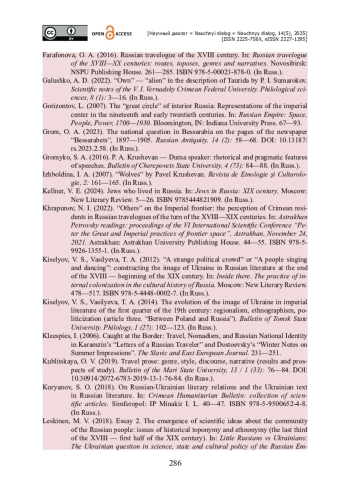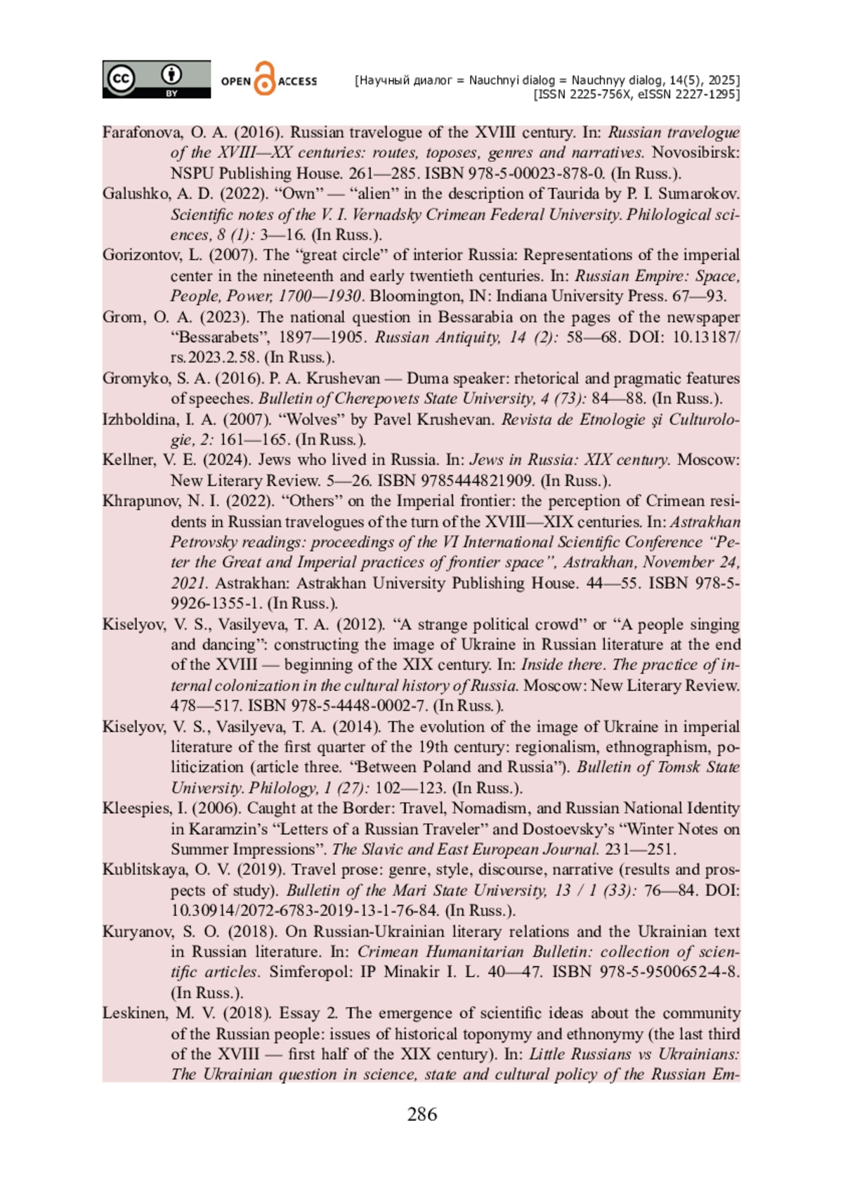 5. Галушко А. Д. «Свое» - «чужое» в описании Тавриды П. И. Сумароковым / А. Д. Галушко // Ученые записки Крымского федерального университета имени В. И. Вернадского. Филологические науки. - 2022. - Т. 8. - № 1. - С. 3-16.