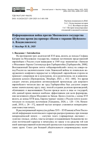 Проведено исследование информационной войны и пропаганды Речи Посполитой против Московского государства в Смутное время. В качестве иллюстрации дан ной проблемы рассматривается польский новостной листок» 1609 года «Песнь о тирании Шуйского» из фондов Российской национальной библиотеки. Полный пере вод «Песни…» на русский язык впервые выполнен автором статьи. Установлено, что данное произведение написано польским мещанским поэтом Адамом Владиславским (Вроцлавчиком). Отмечается, что «Песнь…» призвана была убедить жителей Речи Посполитой в справедливости похода короля Сигизмунда III под Смоленск. Про водится анализ представлений о личности царя Василия Шуйского в произведениях его современников. Проведено сравнение свидетельств современников (иностранных и российских) с текстом «Песни о тирании Шуйского». Сделан вывод, что личность царя в «Песни…» демонизирована в пропагандистских целях. Подчеркивается, что из польско-литовских «новостных листков» культурно-политические стереотипы представлений о московских правителях и русском народе переходят на общеевропейский уровень, где остаются на протяжении последующих веков. Отмечается, что отголоски данных стереотипов мы наблюдаем в западной пропаганде и по сегодняшний день.