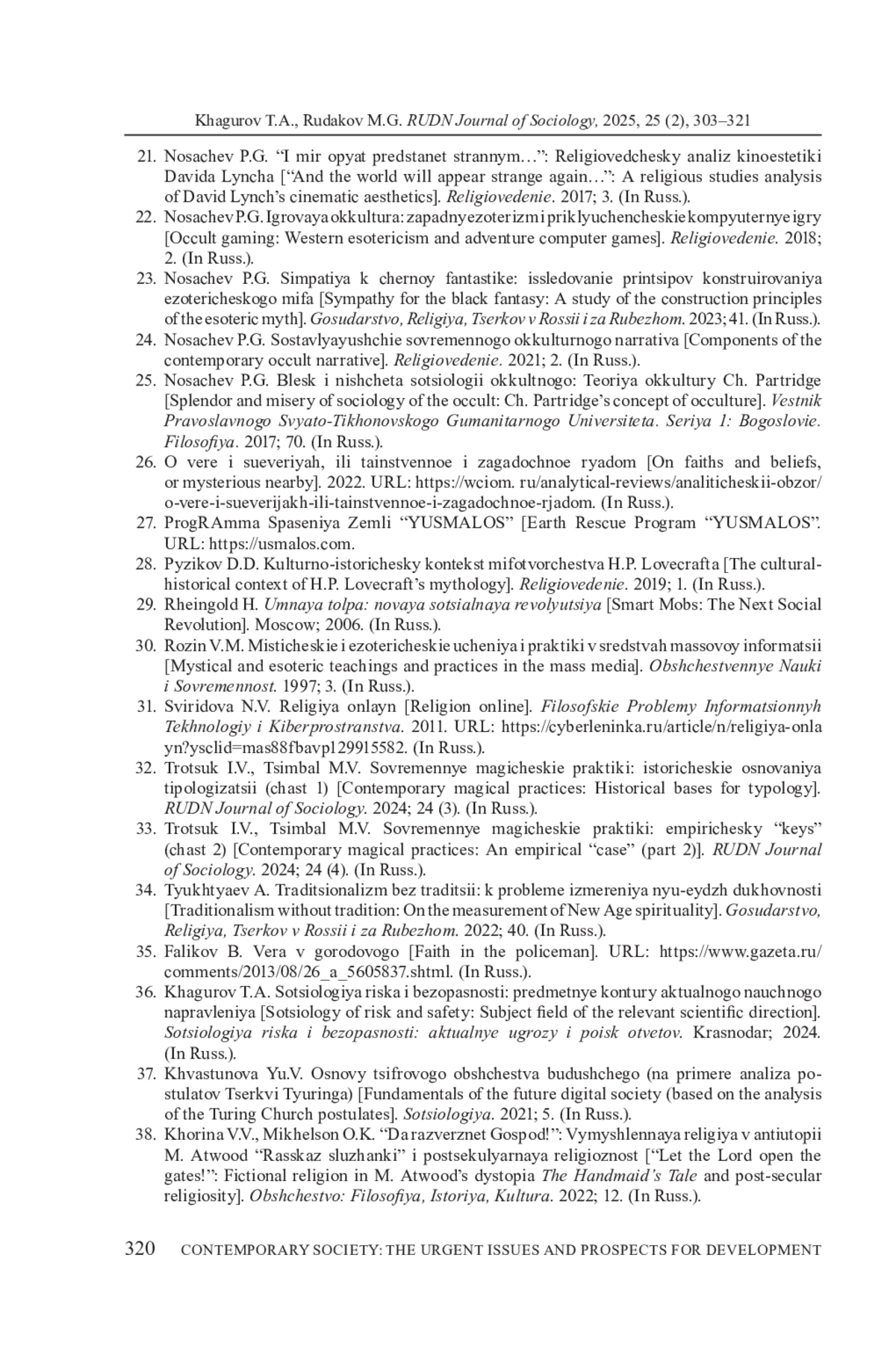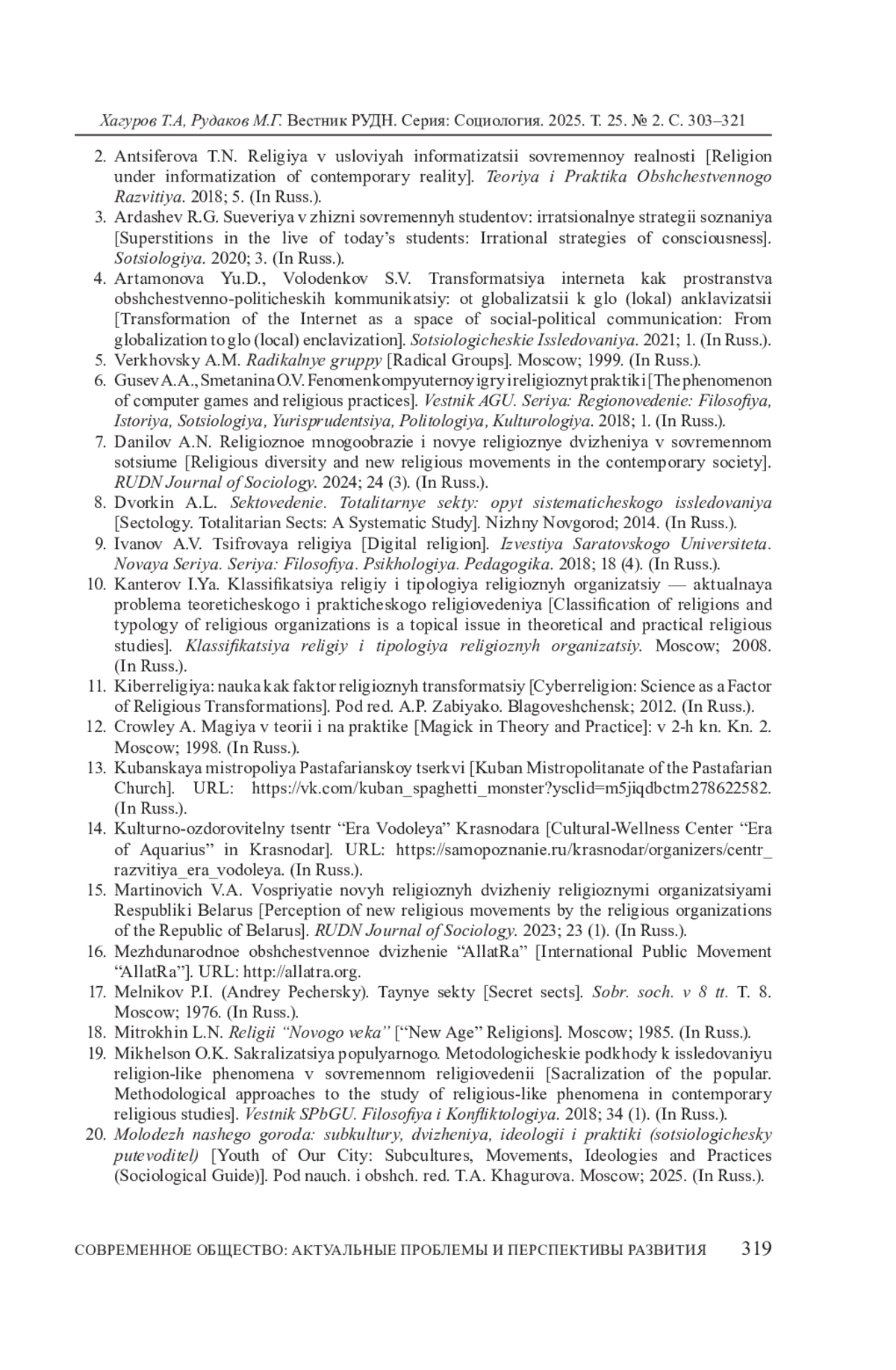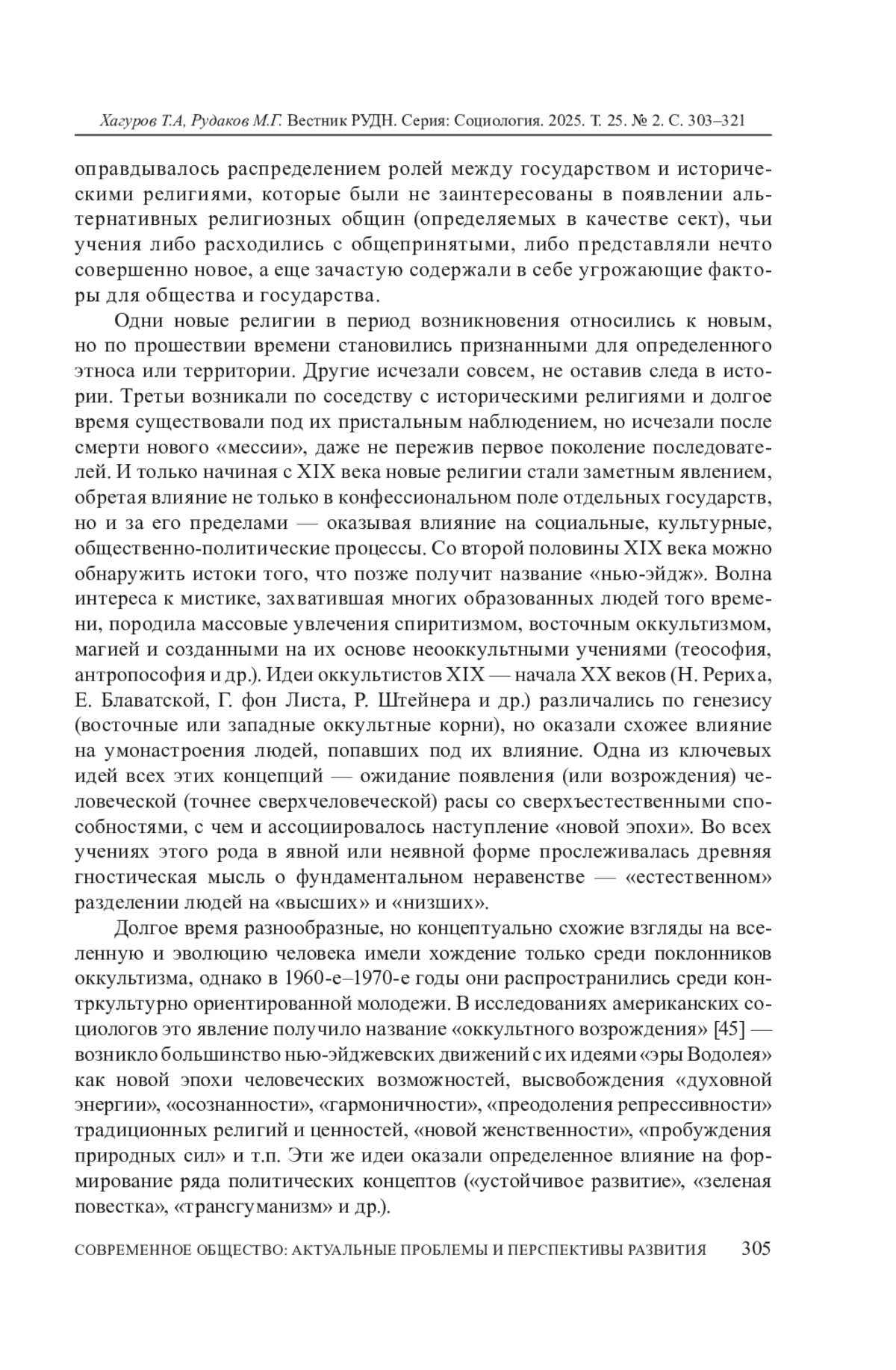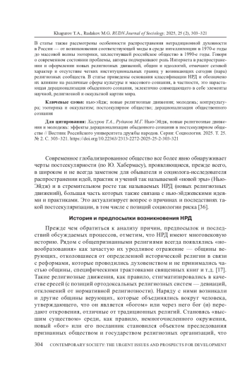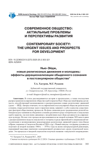 ХАГУРОВ Т. А., РУДАКОВ М. Г. НЬЮ-ЭЙДЖ, НОВЫЕ РЕЛИГИОЗНЫЕ ДВИЖЕНИЯ И МОЛОДЕЖЬ: ЭФФЕКТЫ ДЕРАЦИОНАЛИЗАЦИИ ОБЫДЕННОГО СОЗНАНИЯ В ПОСТСЕКУЛЯРНОМ ОБЩЕСТВЕ // ВЕСТНИК РОССИЙСКОГО УНИВЕРСИТЕТА ДРУЖБЫ НАРОДОВ. СЕРИЯ: СОЦИОЛОГИЯ. 2025. Т. 25 № 2